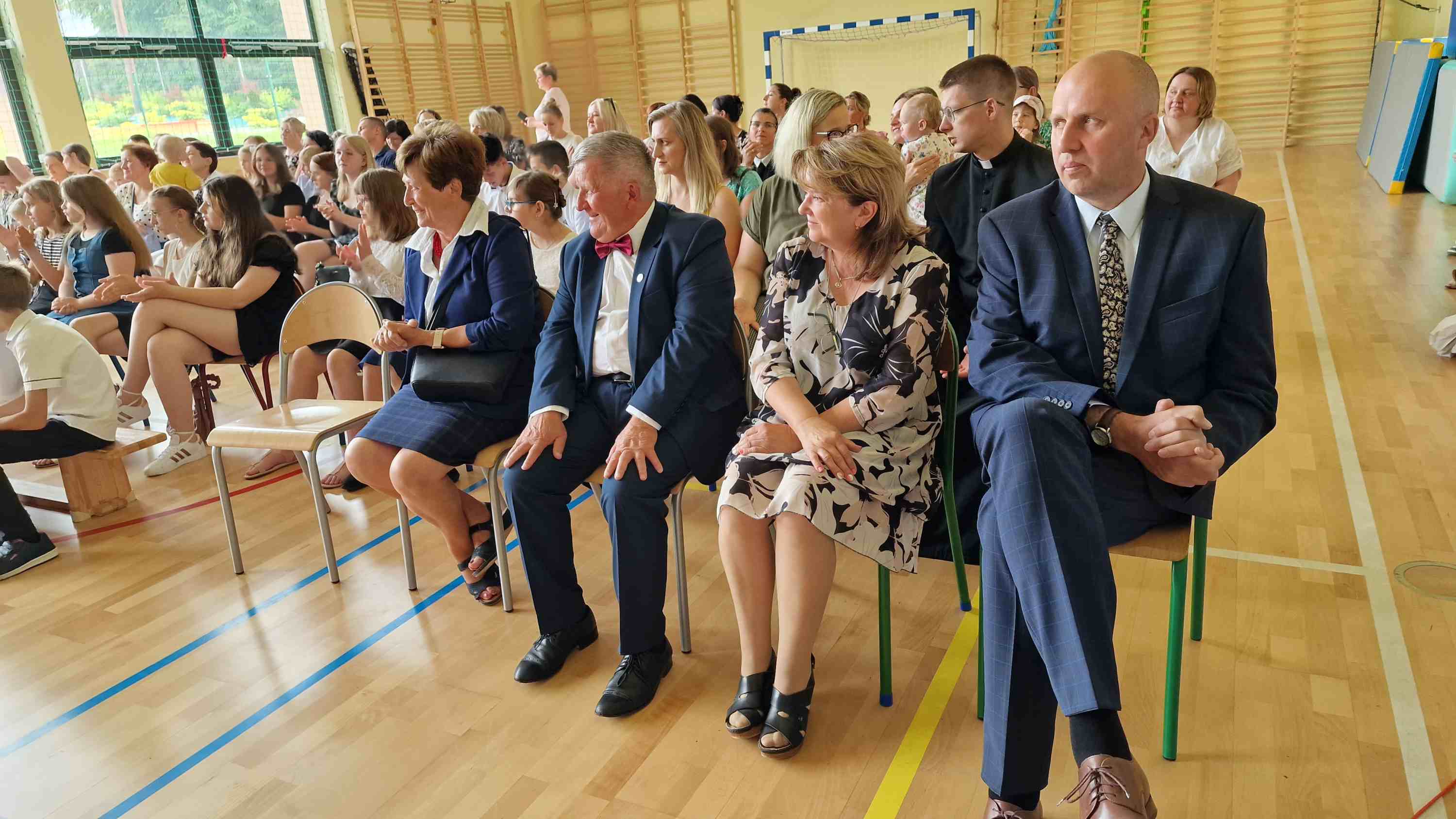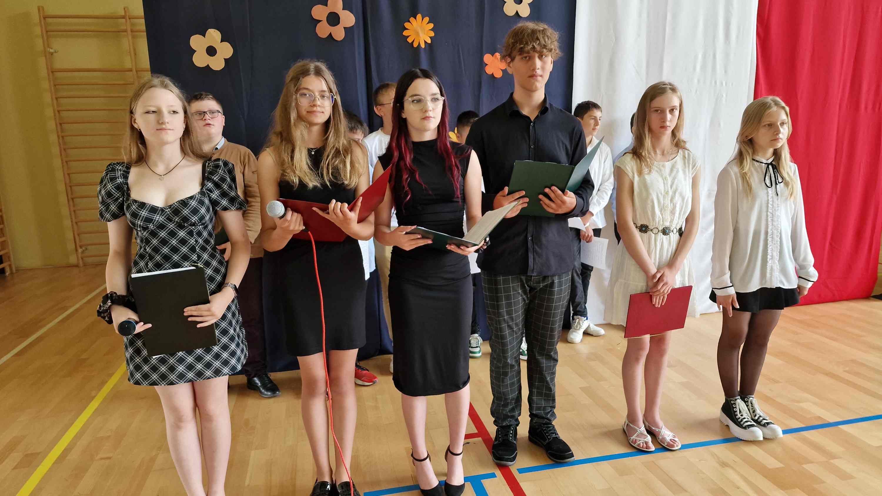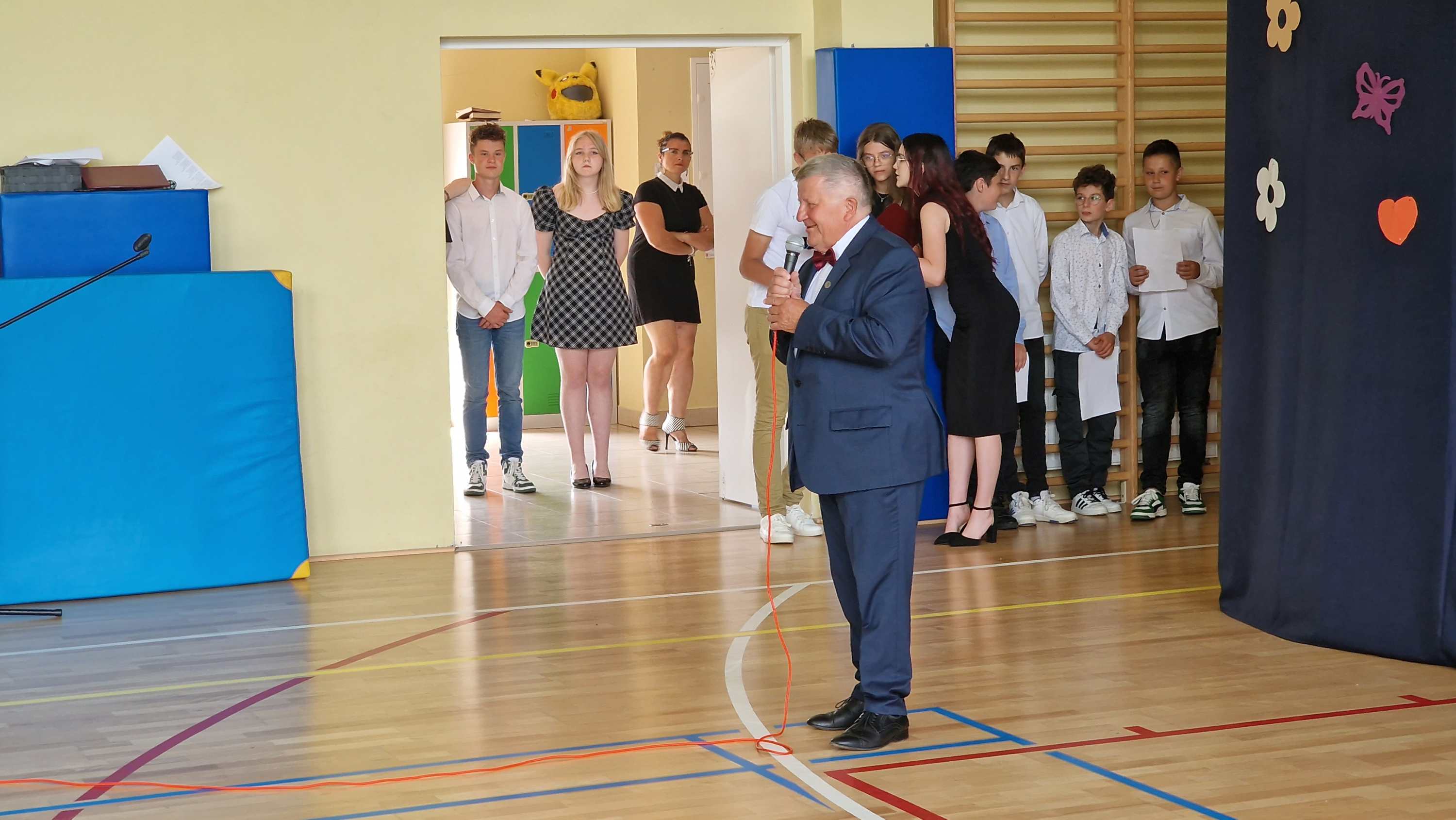 Po dynamicznej i wzruszającej części artystycznej, którą przygotowali Pan mgr Waldemar Kurczab oraz uczniowie klas VIII i VII, nadszedł czas na wyróżnienia. Dyrektor Szkoły, Pani mgr Beata Tokarz, podkreśliła osiągnięcia i zaangażowanie uczniów, którzy otrzymali promocję z wyróżnieniem. To wyjątkowe wyróżnienie potwierdza ich ciężką pracę, poświęcenie i determinację w trakcie całego roku szkolnego.