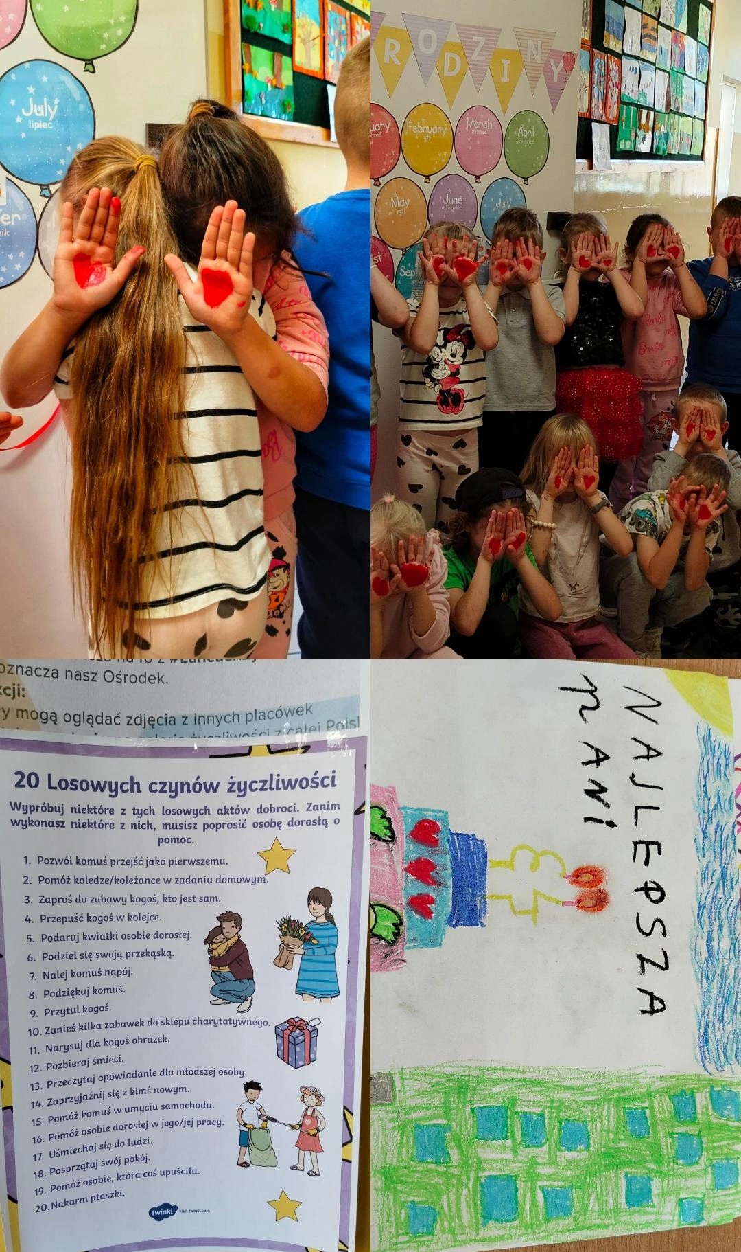 Nasza szkoła wzięła udział również w ogólnopolskiej akcji „Łańcuch Życzliwości”. Zadaniem uczniów było uwiecznienie drobnych gestów dobroci – pomoc koledze, pozytywna wiadomość, uśmiech czy podziękowanie. Powstała z tego piękna galeria zdjęć, która pokazuje, że życzliwość jest obecna w naszej codzienności, a małe gesty mają dużą moc.