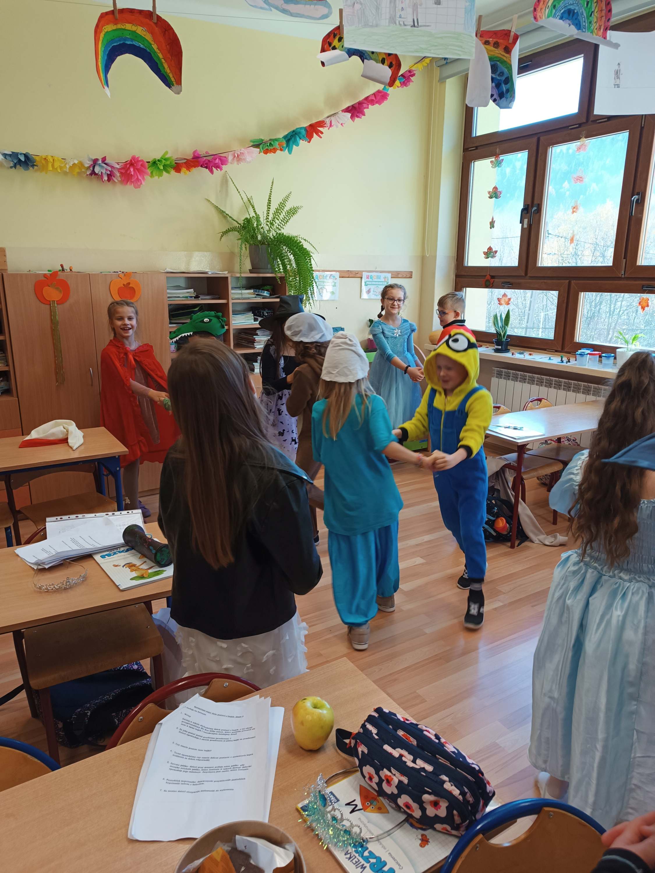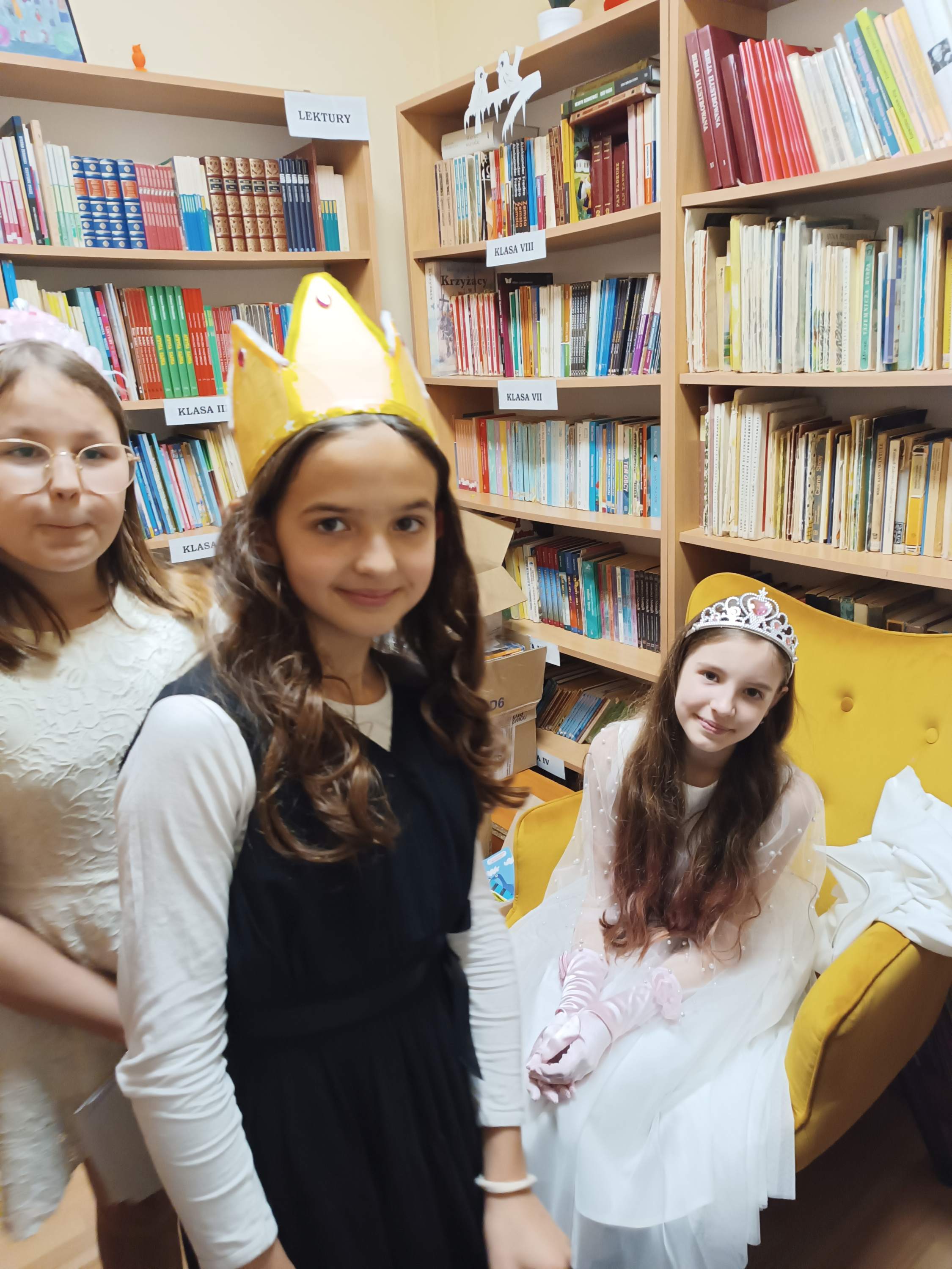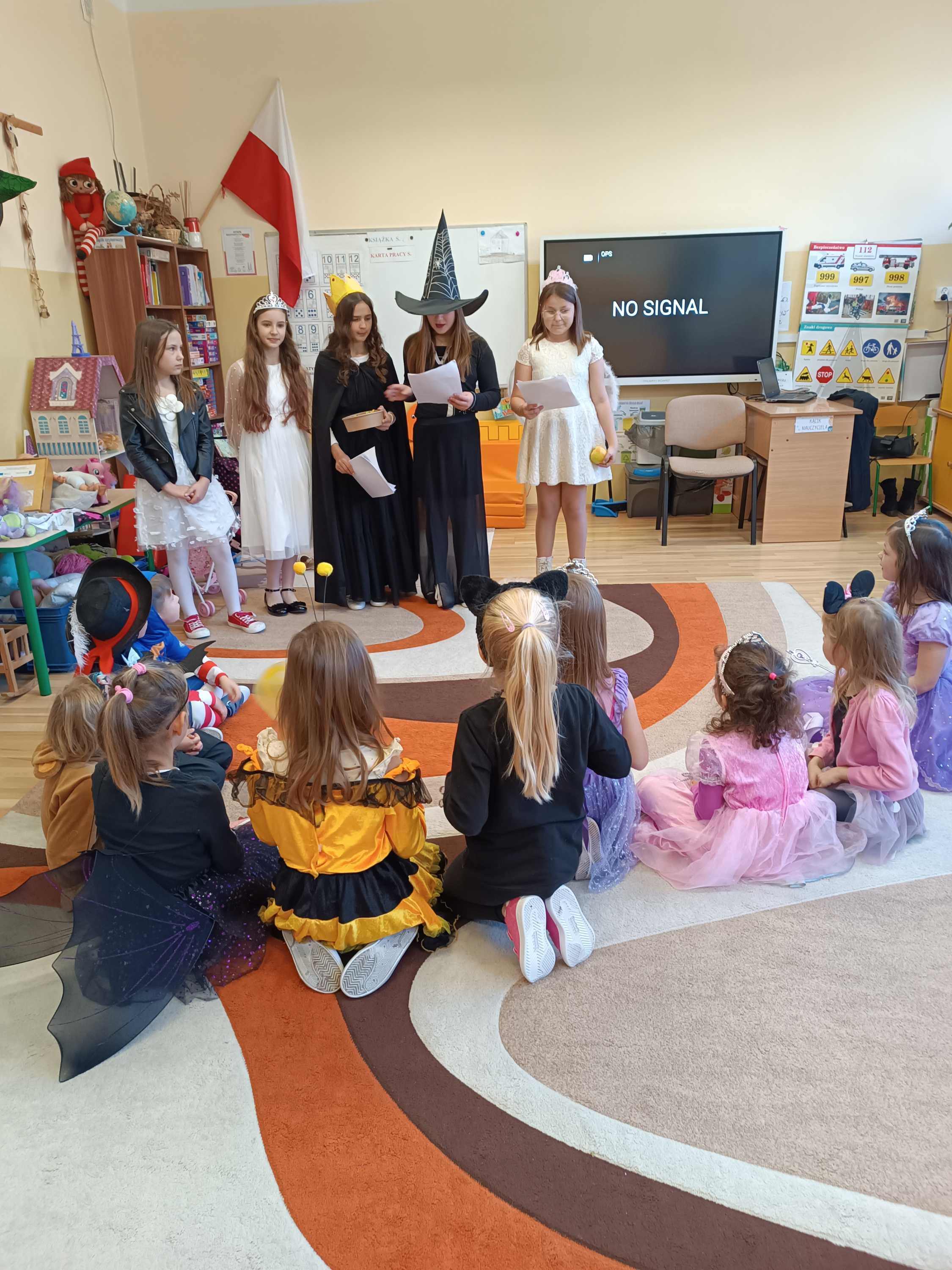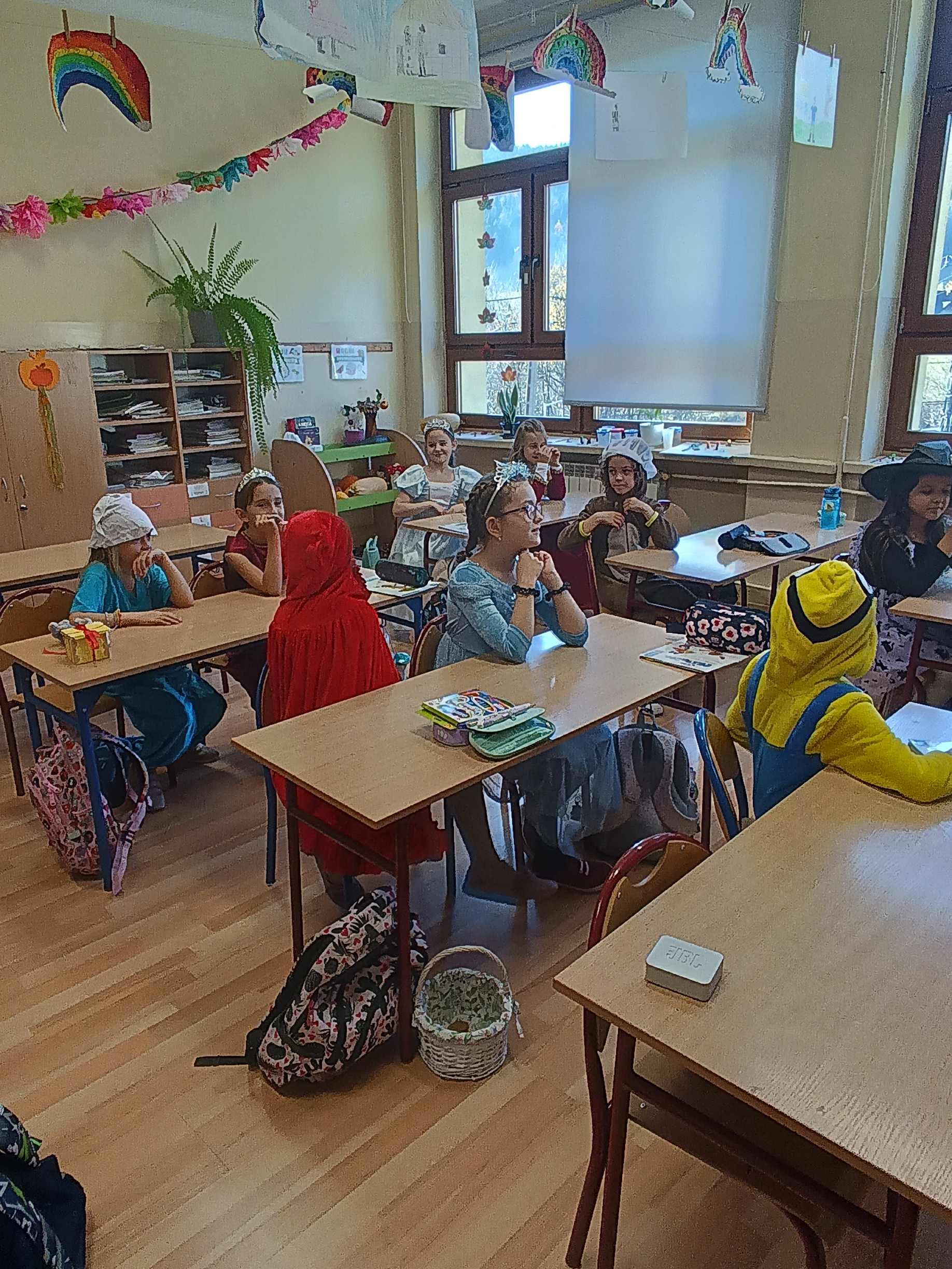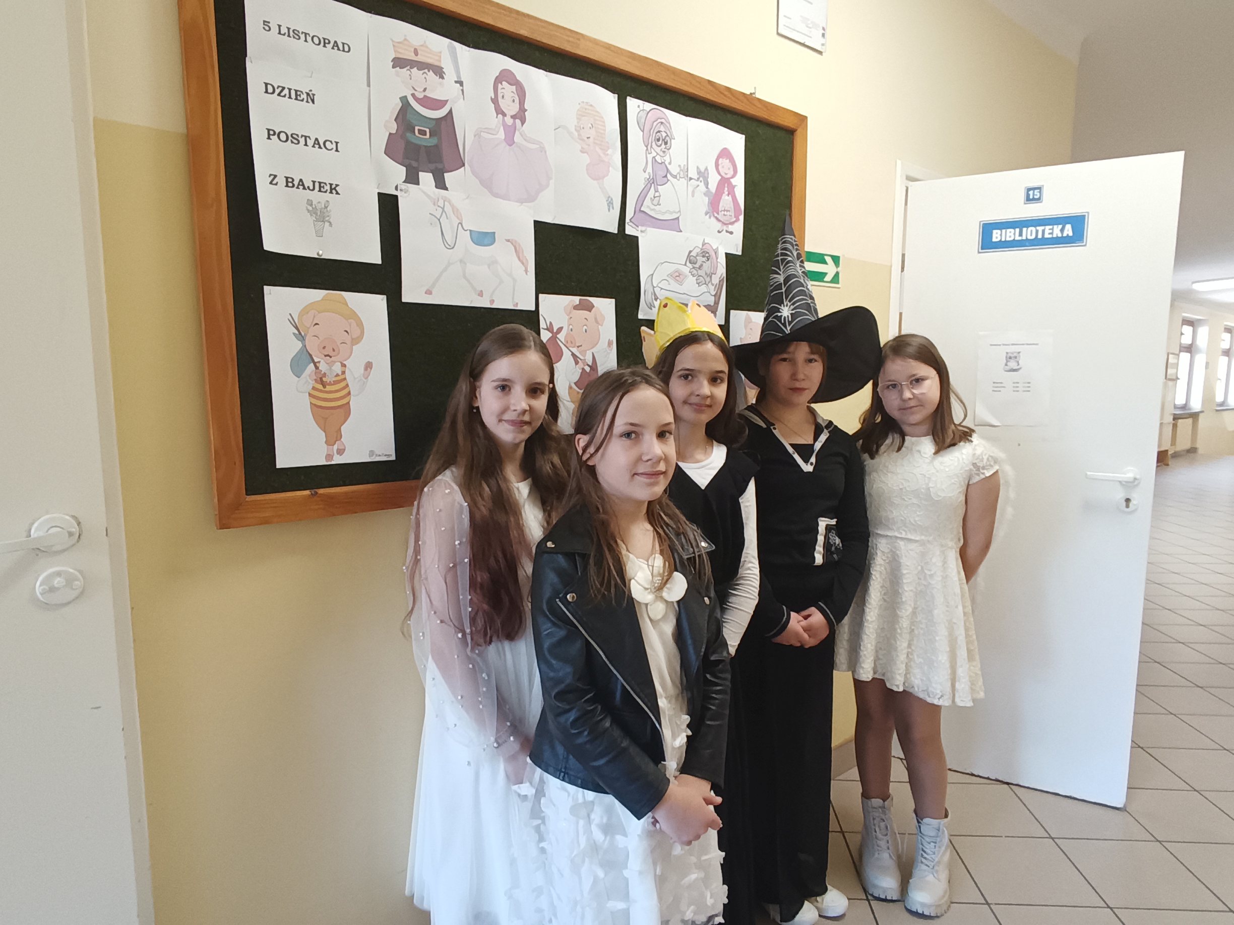 Uczennice z klasy 4 i klasy 5: Magda, Natalia, Zosia, Zuzia i Ewelina sprawdzały wiedzę uczniów na temat bohaterów z bajek, w postaci pytań i krzyżówek. Nie zabrakło również licznych zabaw związanych tematycznie z bajkami. W tym dniu na twarzach wielu dzieci pojawił się ogromny uśmiech i radość.