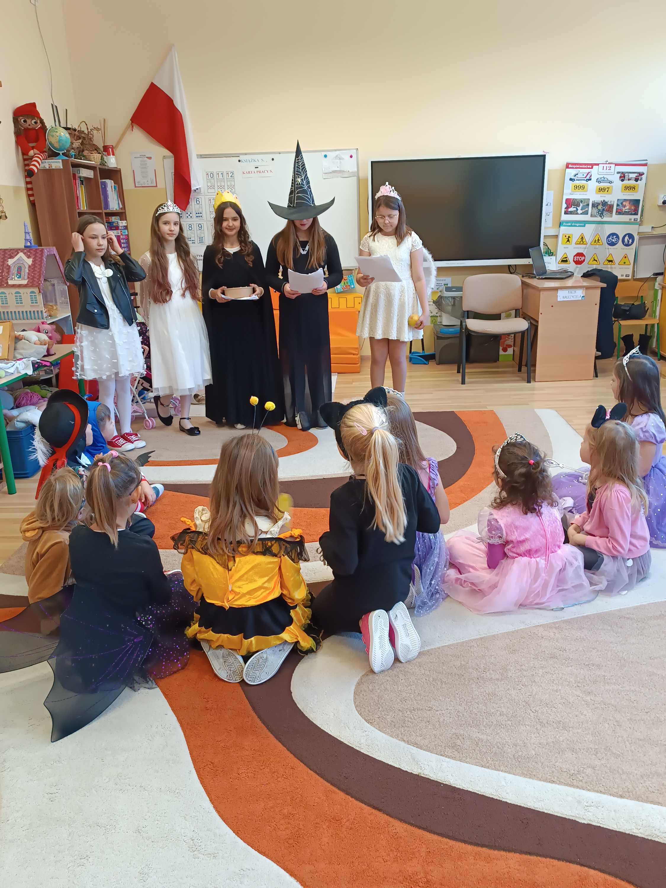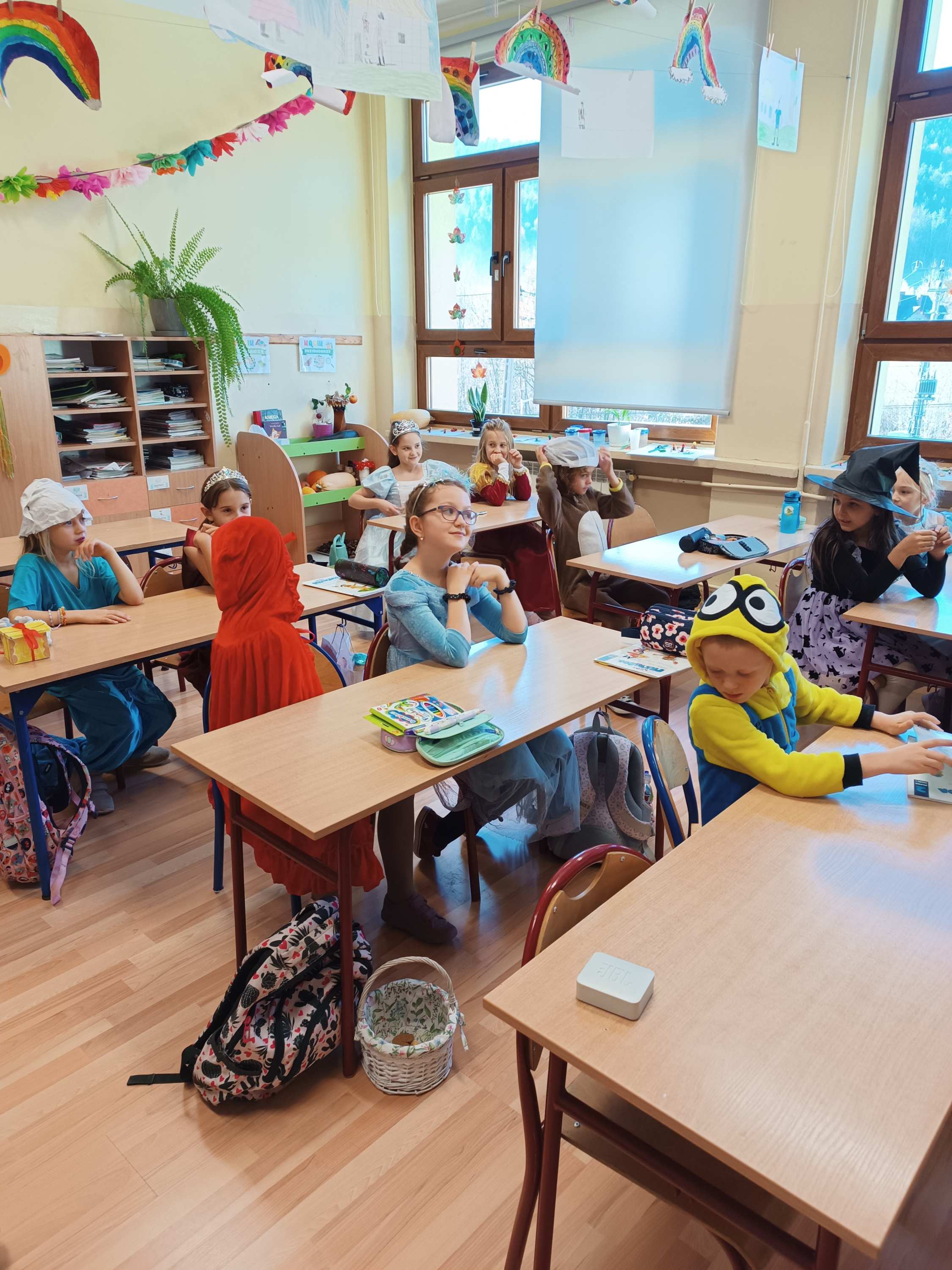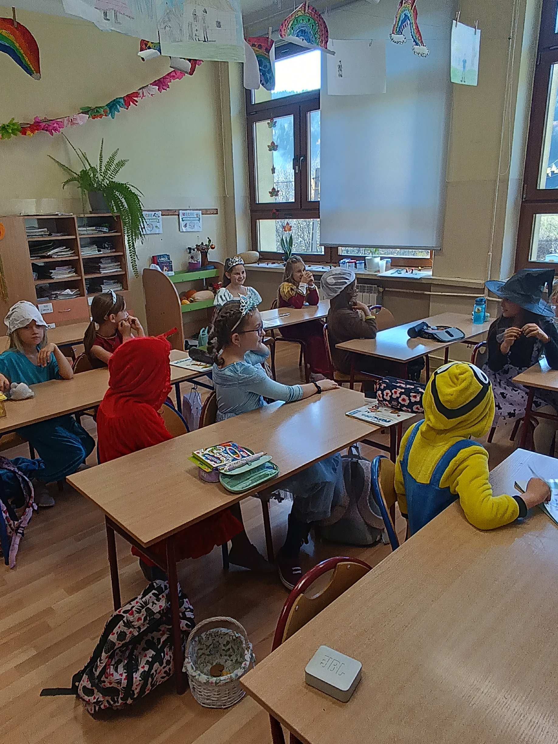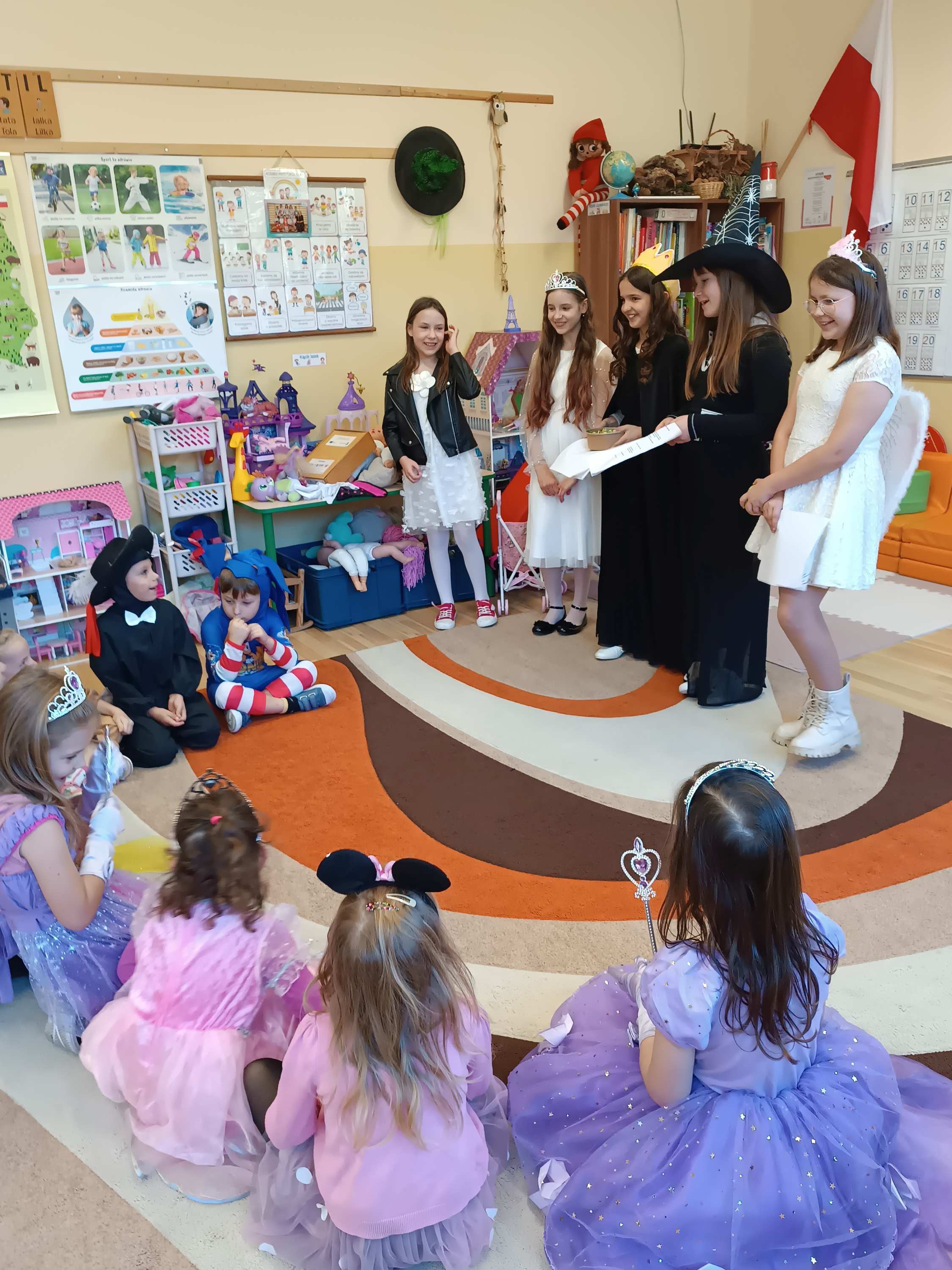 Uczennice z klasy 4 i klasy 5: Magda, Natalia, Zosia, Zuzia i Ewelina sprawdzały wiedzę uczniów na temat bohaterów z bajek, w postaci pytań i krzyżówek. Nie zabrakło również licznych zabaw związanych tematycznie z bajkami. W tym dniu na twarzach wielu dzieci pojawił się ogromny uśmiech i radość.