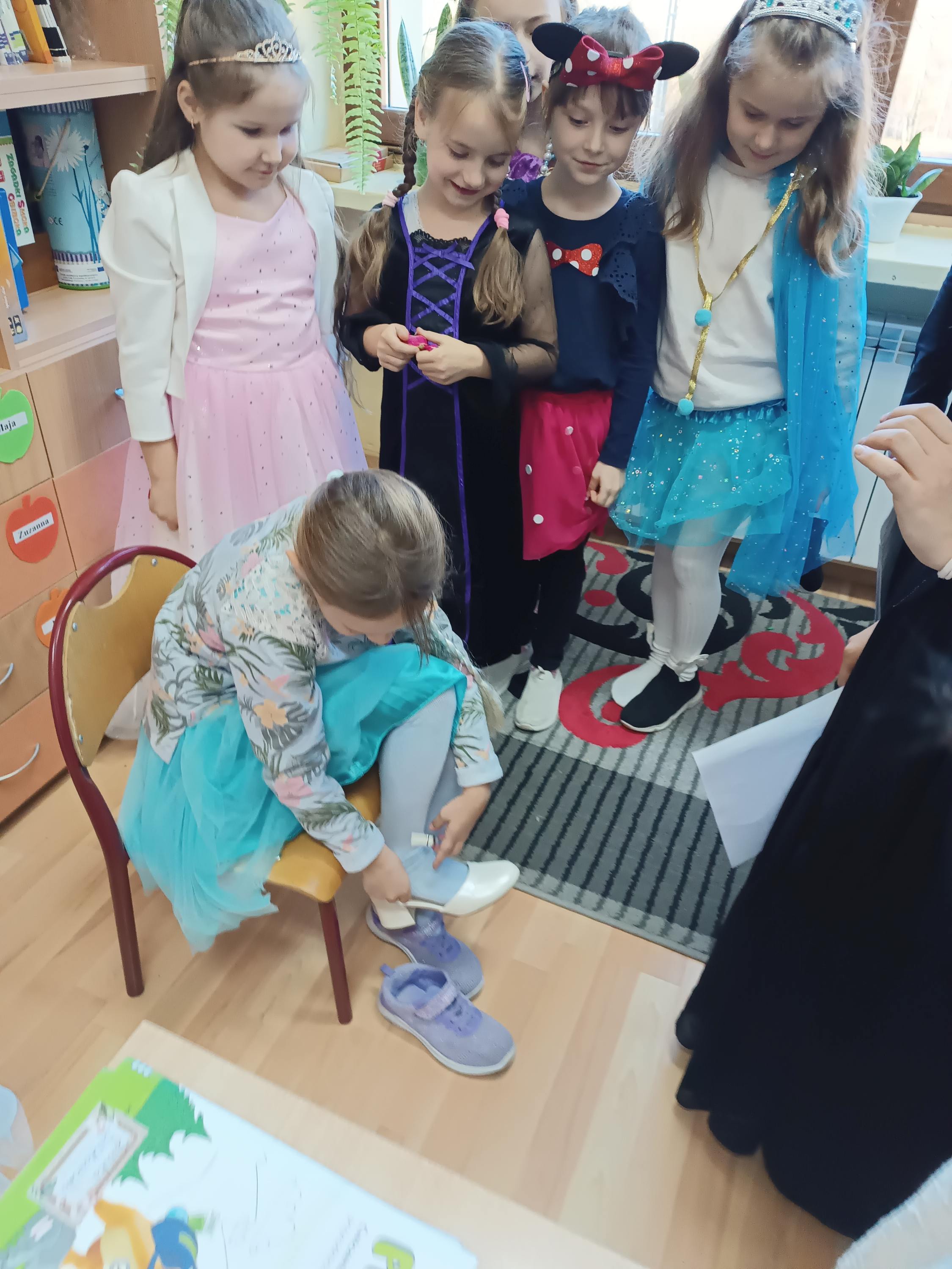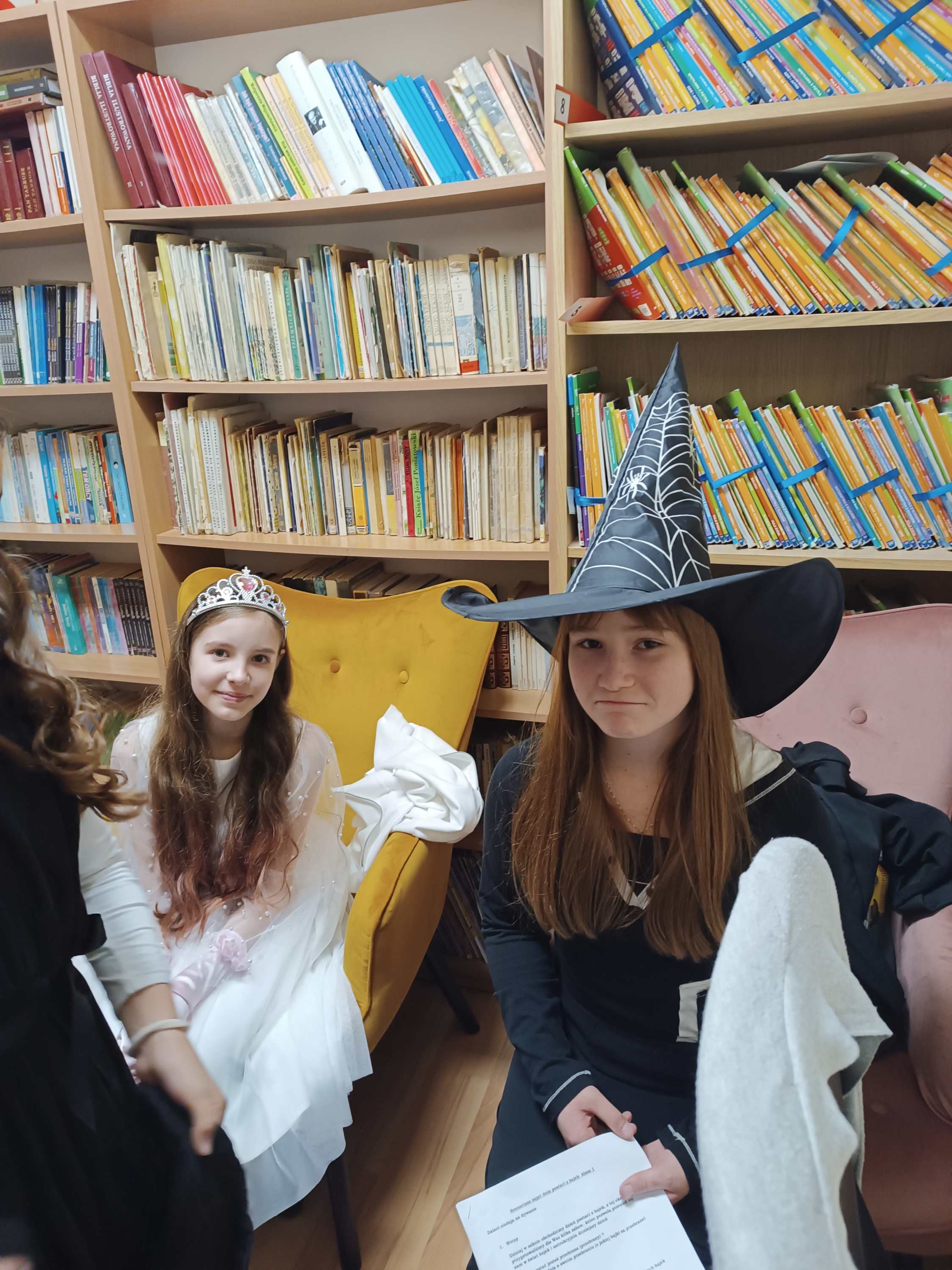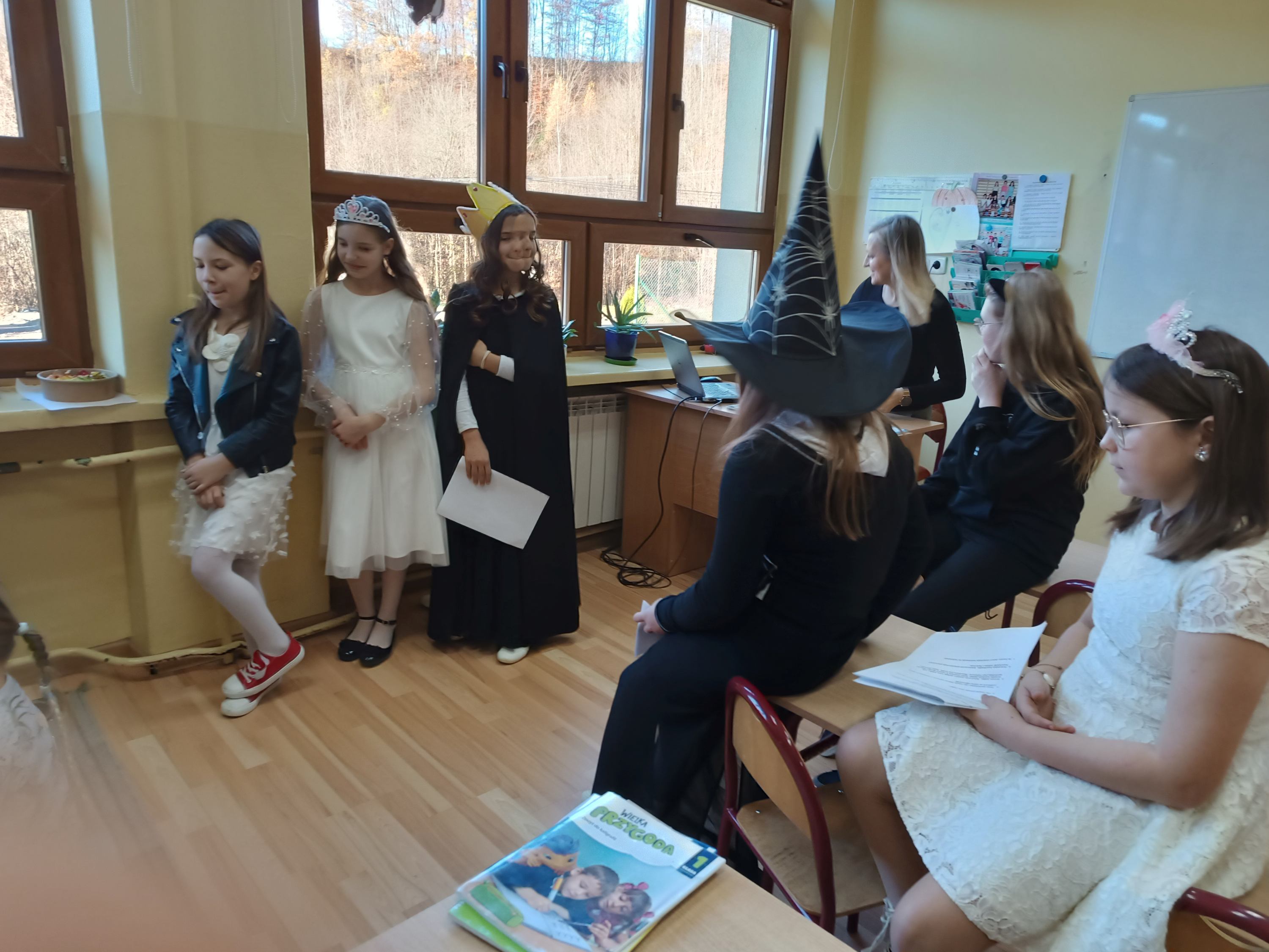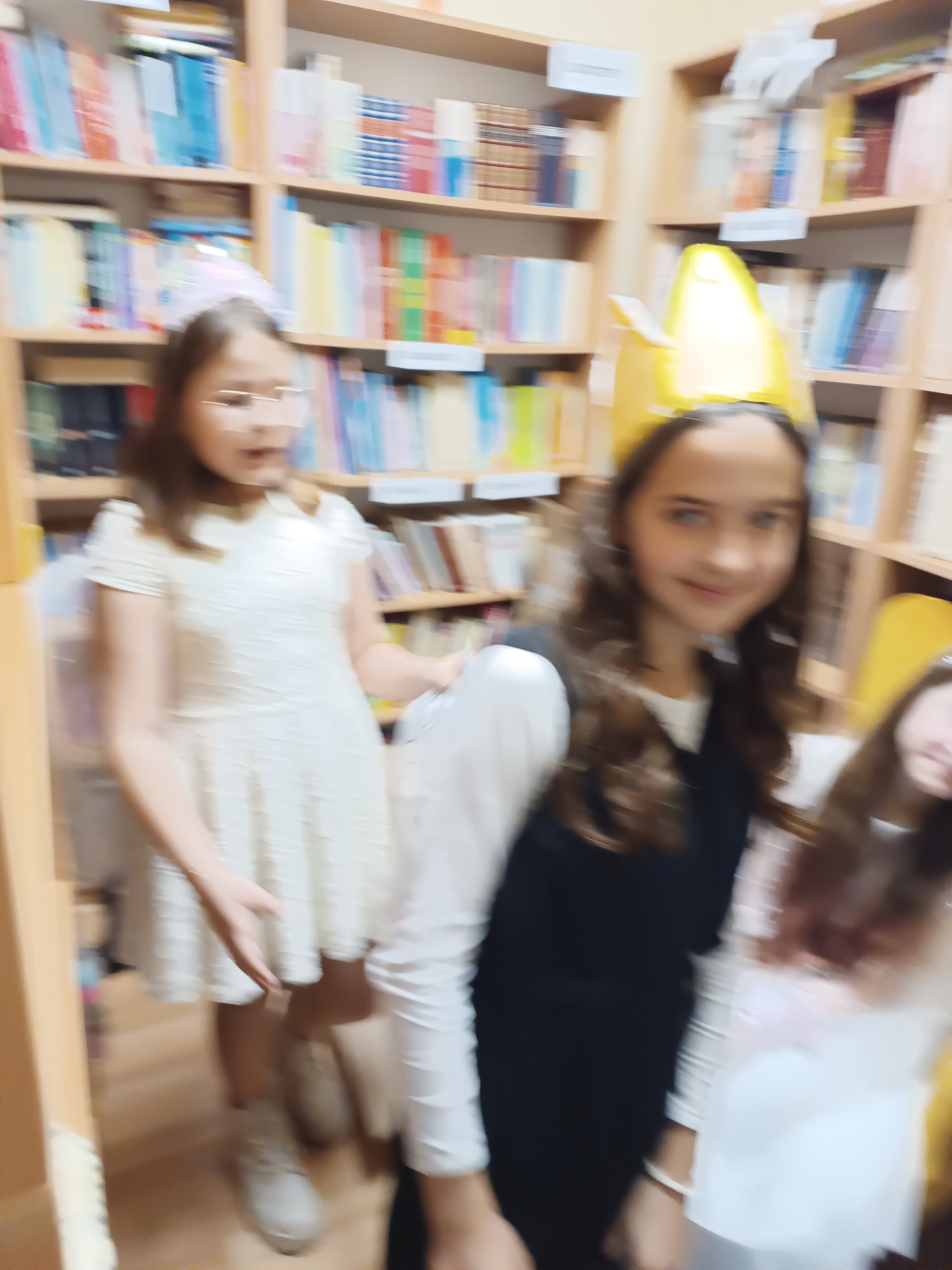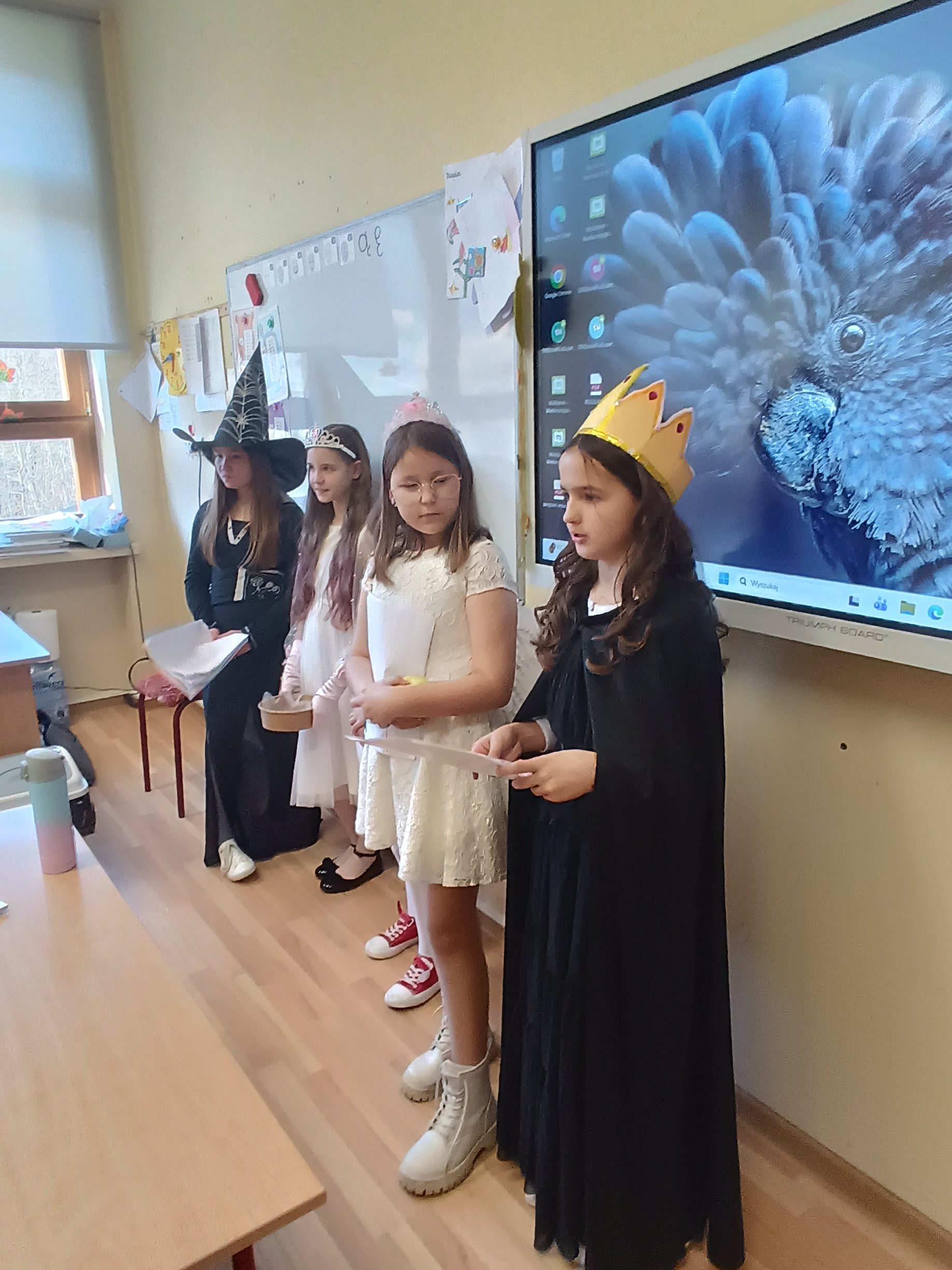 Uczennice z klasy 4 i klasy 5: Magda, Natalia, Zosia, Zuzia i Ewelina sprawdzały wiedzę uczniów na temat bohaterów z bajek, w postaci pytań i krzyżówek. Nie zabrakło również licznych zabaw związanych tematycznie z bajkami. W tym dniu na twarzach wielu dzieci pojawił się ogromny uśmiech i radość.
