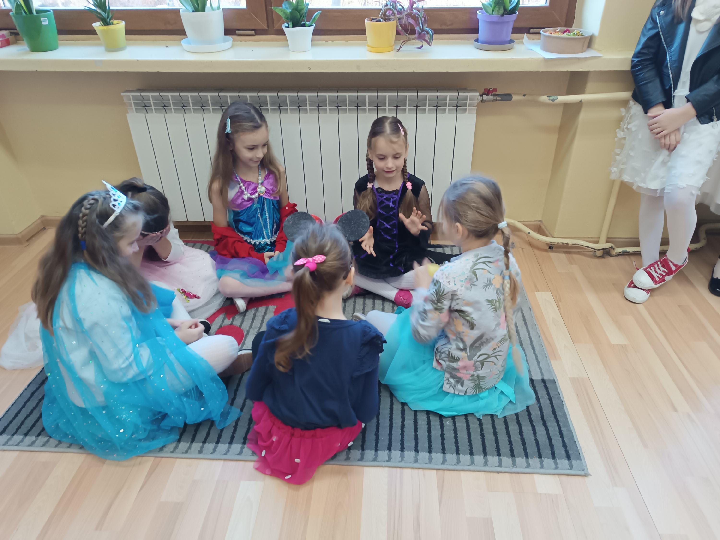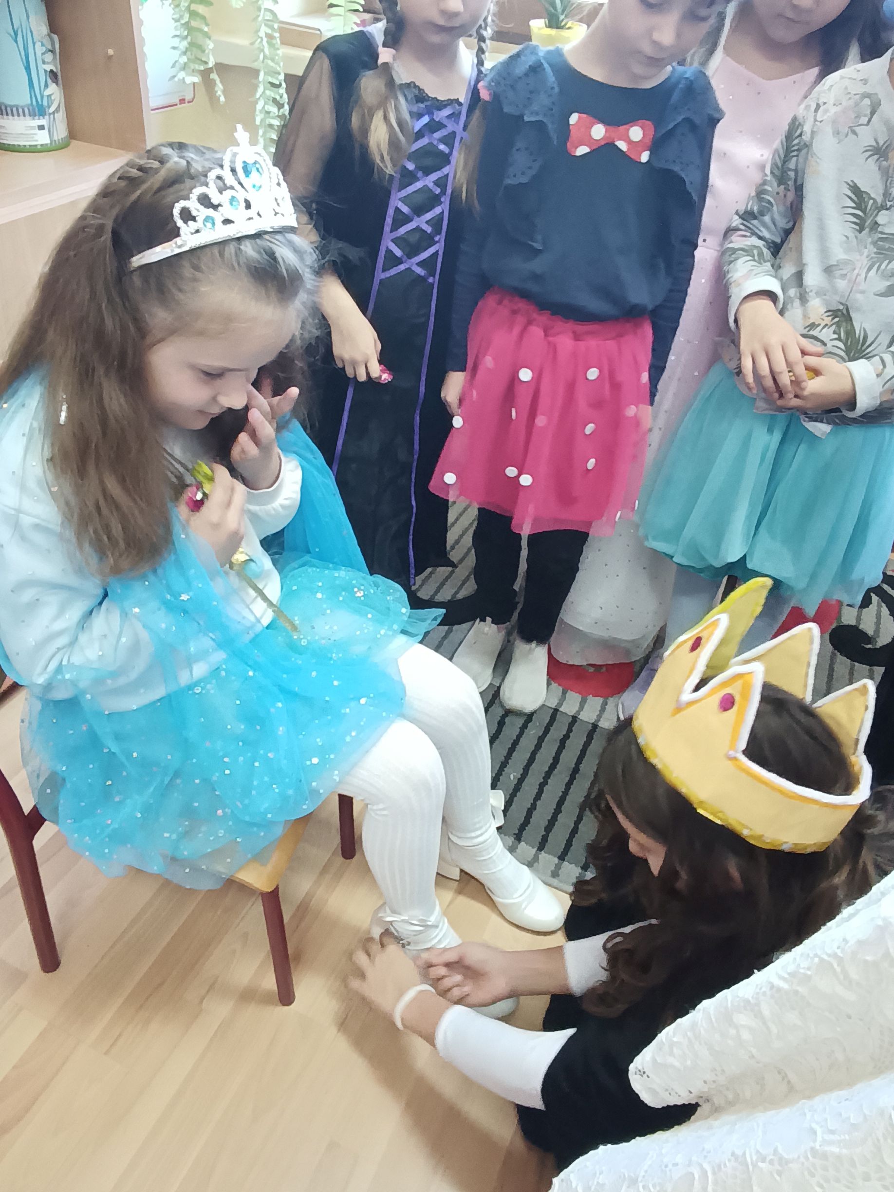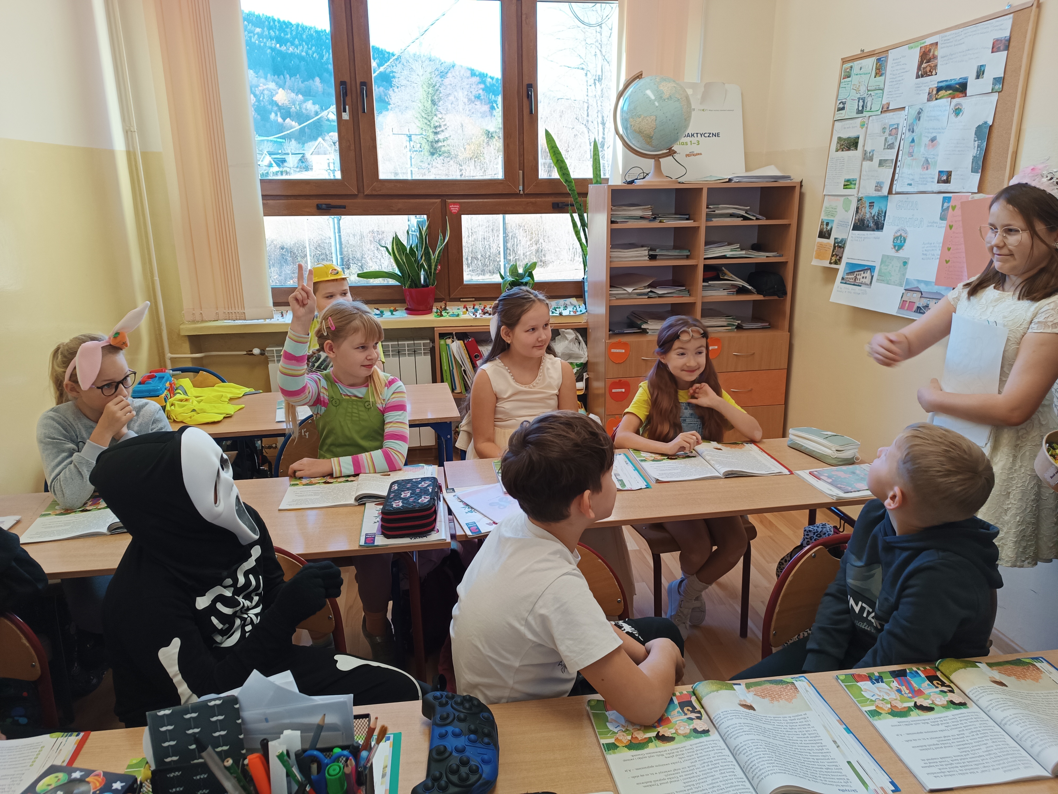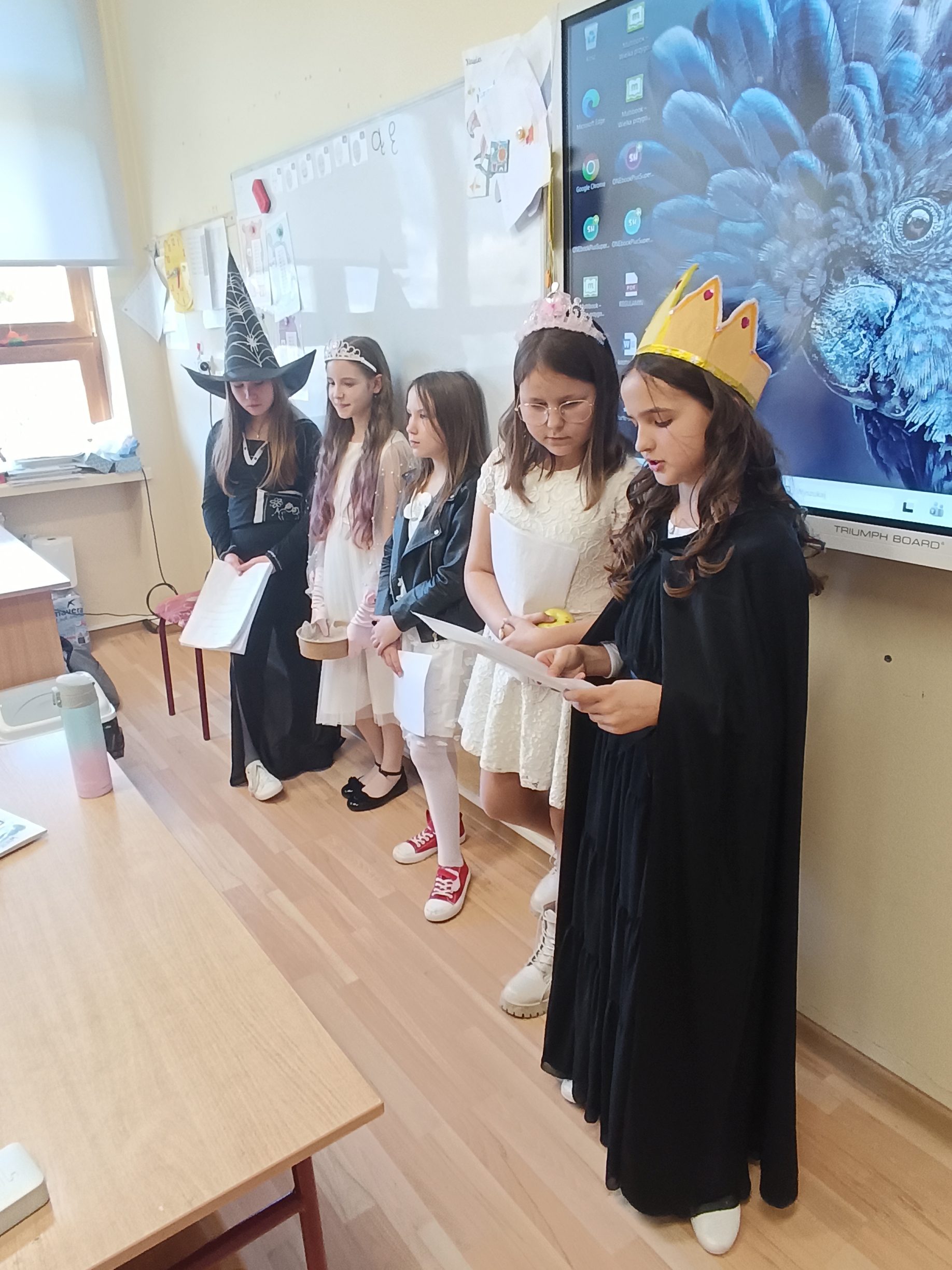 Uczennice z klasy 4 i klasy 5: Magda, Natalia, Zosia, Zuzia i Ewelina sprawdzały wiedzę uczniów na temat bohaterów z bajek, w postaci pytań i krzyżówek. Nie zabrakło również licznych zabaw związanych tematycznie z bajkami. W tym dniu na twarzach wielu dzieci pojawił się ogromny uśmiech i radość.