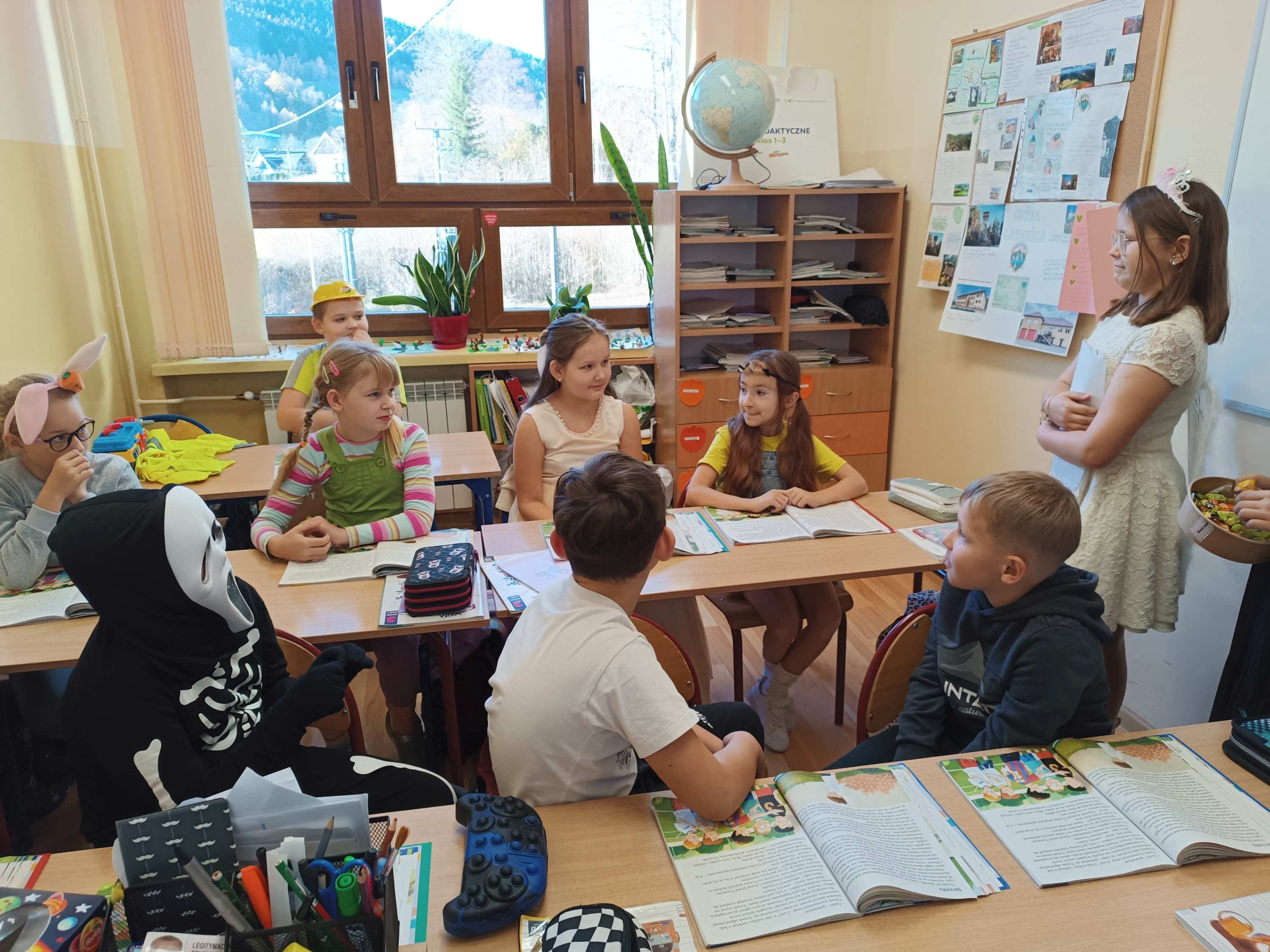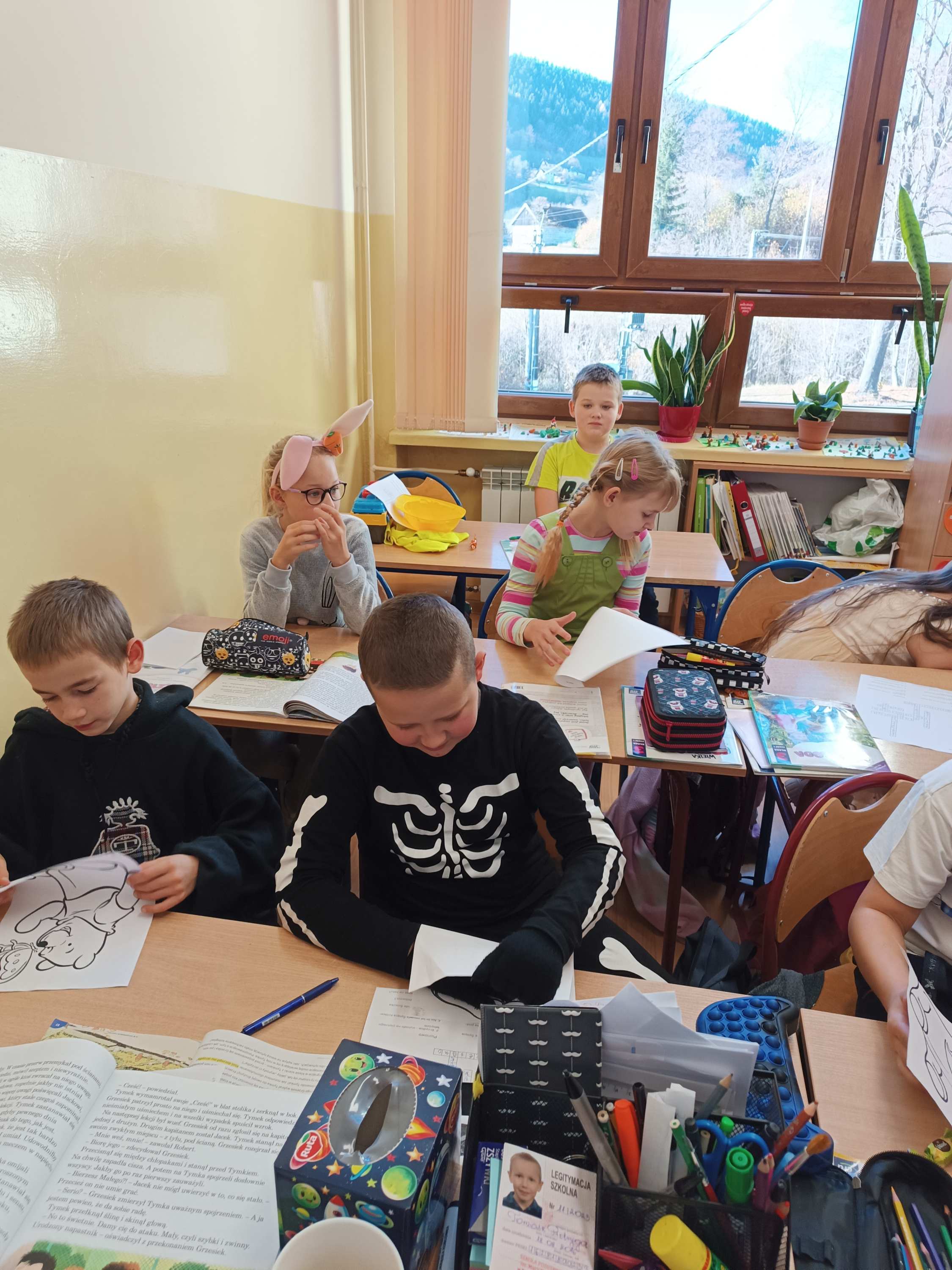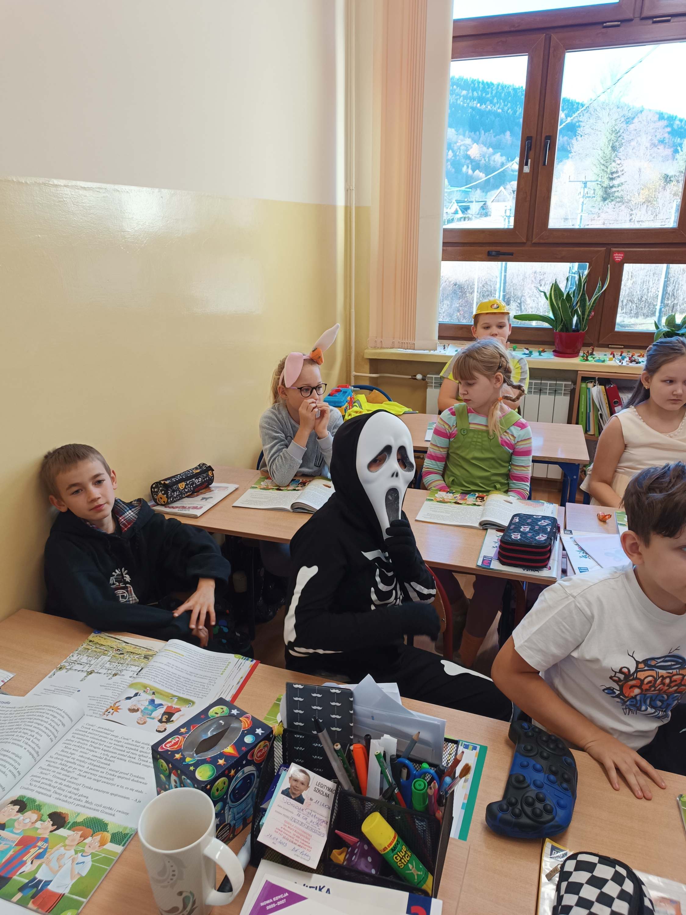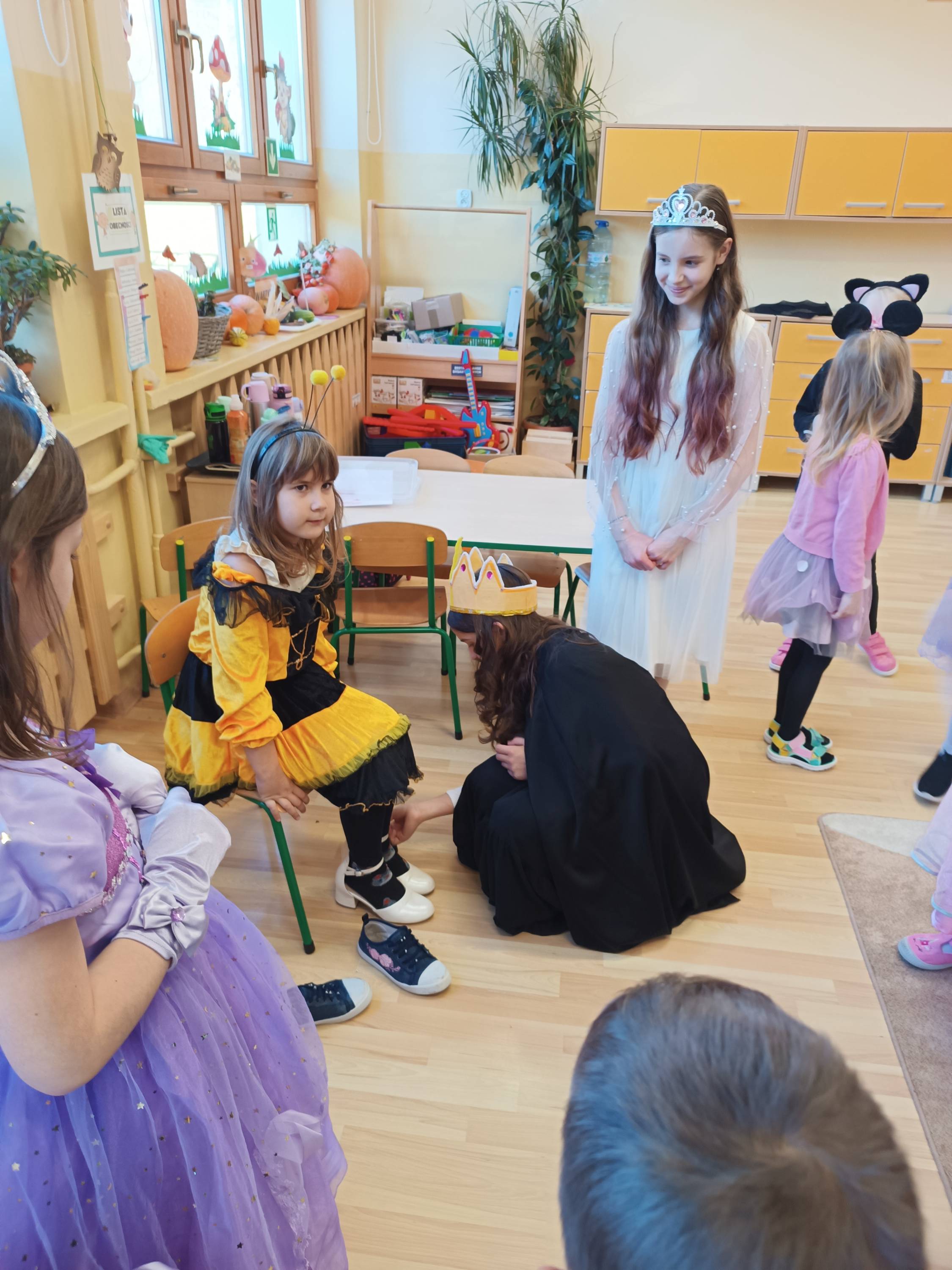 Uczennice z klasy 4 i klasy 5: Magda, Natalia, Zosia, Zuzia i Ewelina sprawdzały wiedzę uczniów na temat bohaterów z bajek, w postaci pytań i krzyżówek. Nie zabrakło również licznych zabaw związanych tematycznie z bajkami. W tym dniu na twarzach wielu dzieci pojawił się ogromny uśmiech i radość.