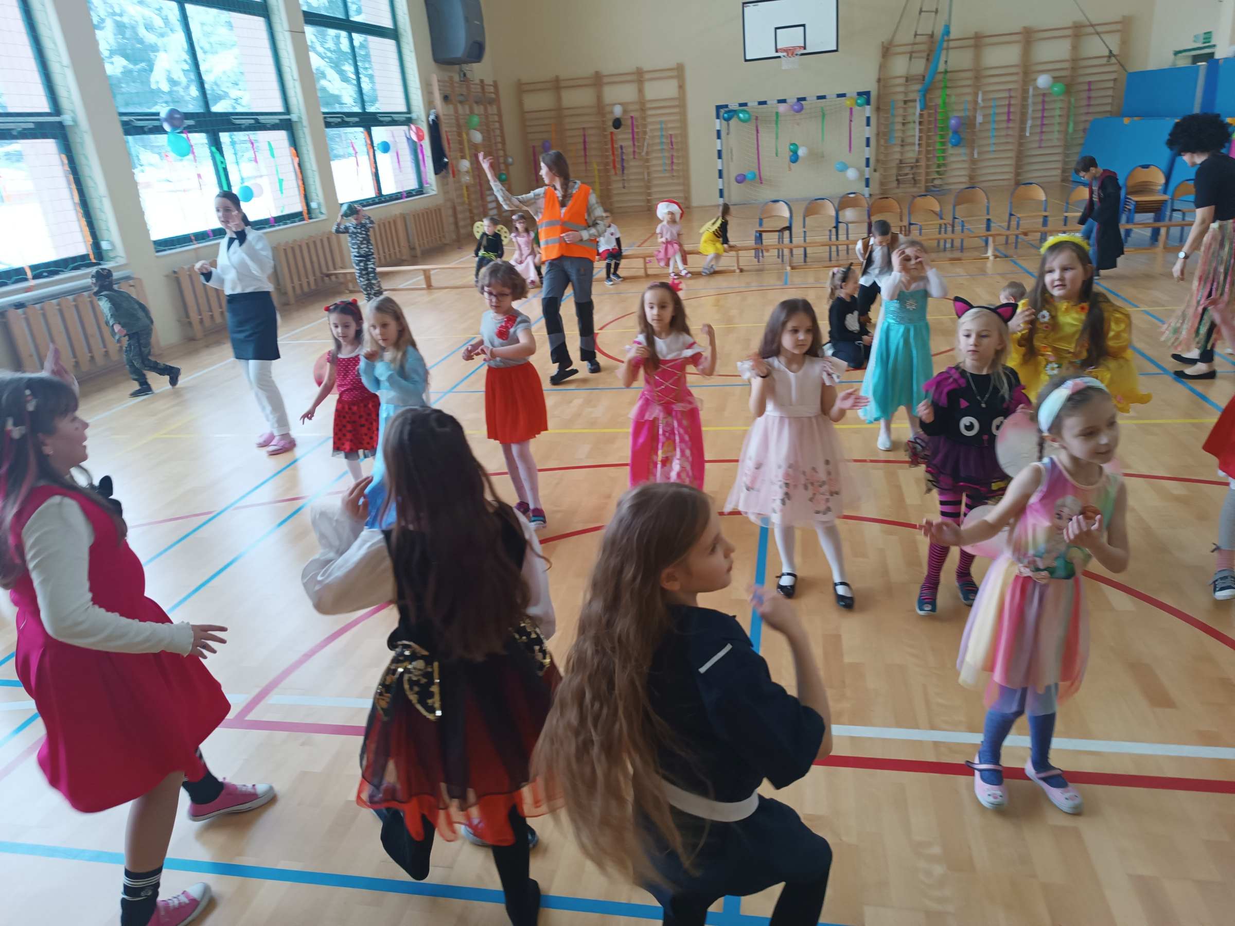 Na szkolnych korytarzach można było zobaczyć wiele barwnych postaci m.in. wróżek, księżniczek, policjantów, piłkarzy, bohaterów bajek i zwierząt. Zabawa miała miejsce na sali gimnastycznej, która została udekorowana z pomocą uczniów, nauczycieli i Pań odbywających praktyki w Naszej Szkole.