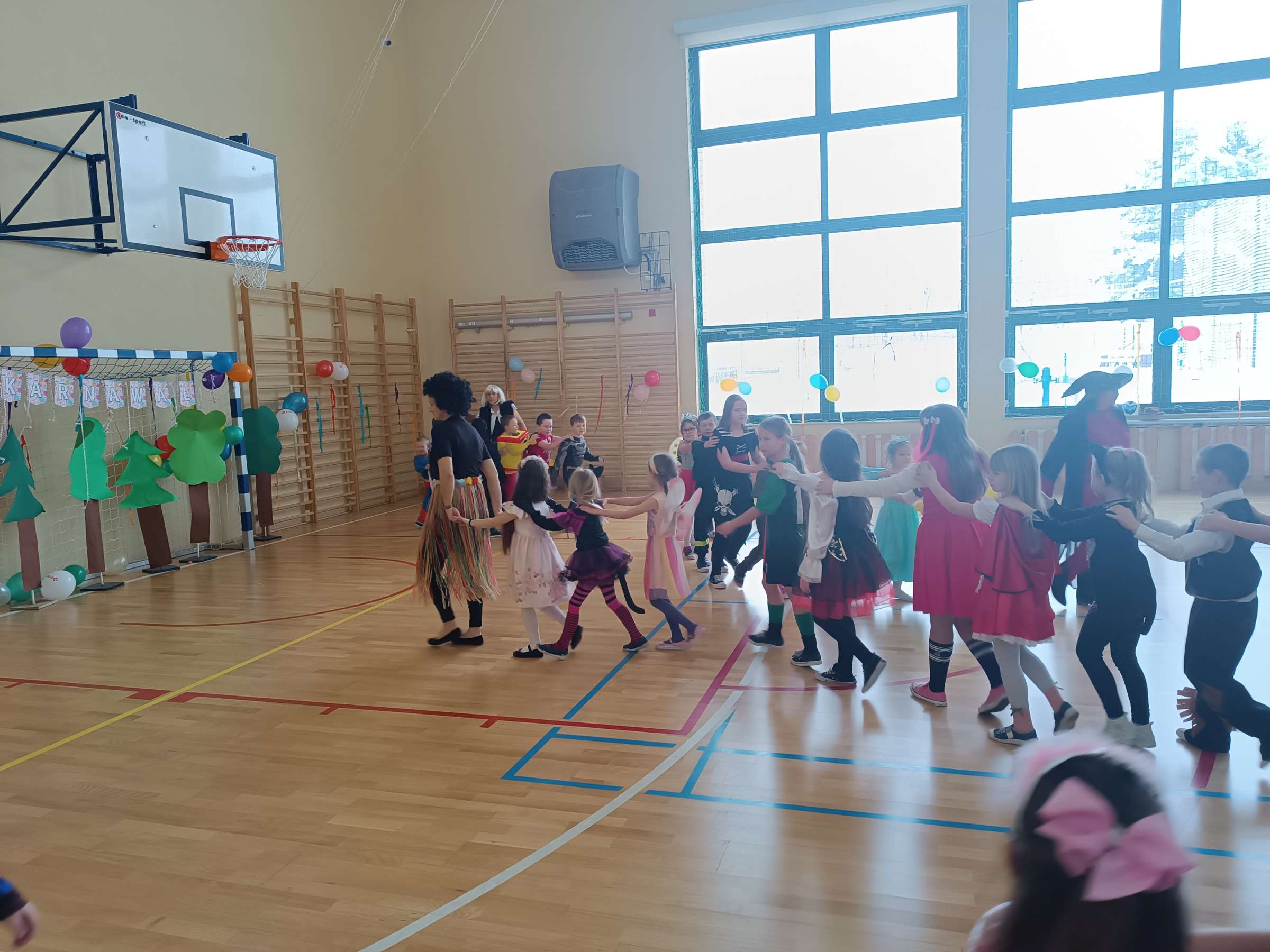 Prowadzący zabawę sprawili, że wzięły w niej udział zarówno dzieci, jak i wychowawcy klas. Były jazdy pociągów, korowody, koła małe i duże, zabawy w parach na gazecie, a także grupowe rywalizacje z krzesełkami. W przerwach zabawy dzieci mogły się posilić przygotowanym przez Rodziców poczęstunkiem, w którym motywem przewodnim były pączki.