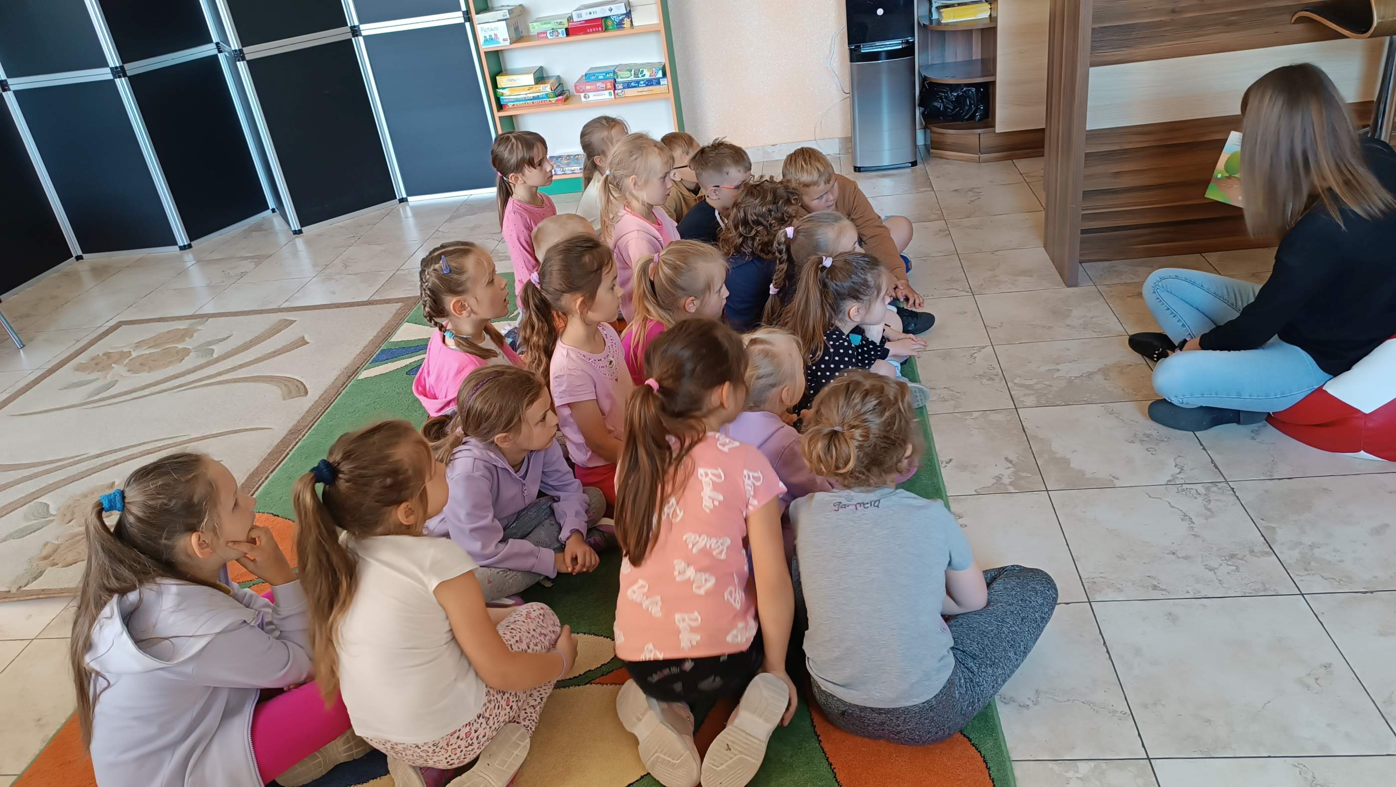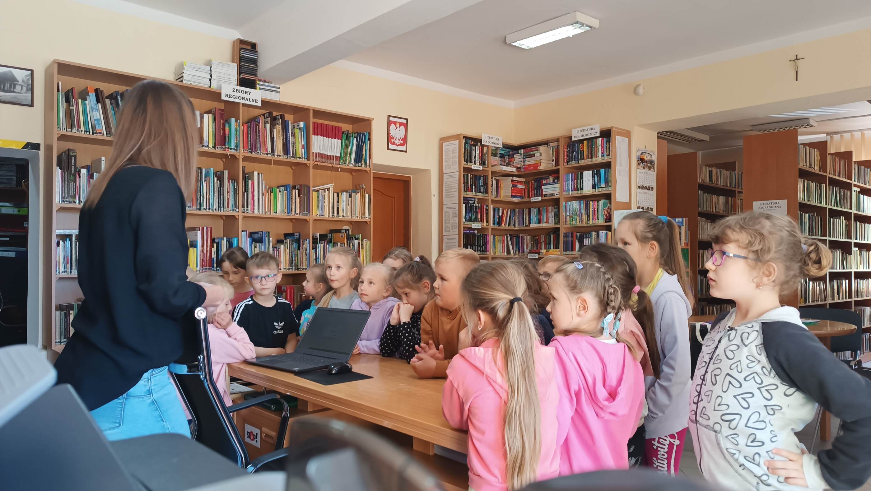 W trakcie zajęć edukacyjnych w bibliotece Pani Katarzyna Bochenek opowiedziała dzieciom o pracy „Bibliotekarki”. Dzieci wraz z nauczycielem zapoznały się z zasadami wypożyczania książek, a także z regulaminem projektu pt.: „Mała Książka – Wielki Człowiek”, który jest organizowany przez Instytut Książki we współpracy z bibliotekami. W ramach tego Projektu dzieciom wydawane są tzw. „Wyprawki Czytelnicze”, składające się z: Karty Małego Czytelnika, naklejek oraz książek wraz z broszurą dla rodziców. Do udziału w Projekcie konieczne jest zapisanie dziecka do biblioteki i wypożyczenie, co najmniej jednej książki