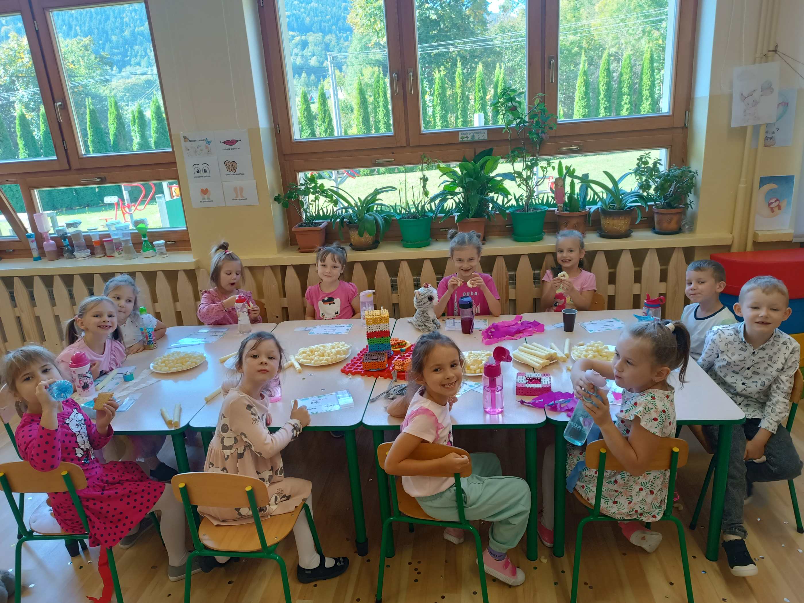 We wrześniu dzieci w oddziale przedszkolnym rozwijały swoje zdolności poznawcze, aktywnie uczestniczyły w zabawach ruchowych. Odkrywały za pomocą zmysłu dotyku różne przedmioty, a także klasyfikowały je według podanego kryterium. Razem z wychowawcą utworzyły kodeks grupowy, normy i zasady postępowania w sali przedszkolnej, a także rozwijały umiejętności poszanowania wspólnych sprzętów i zabawek.