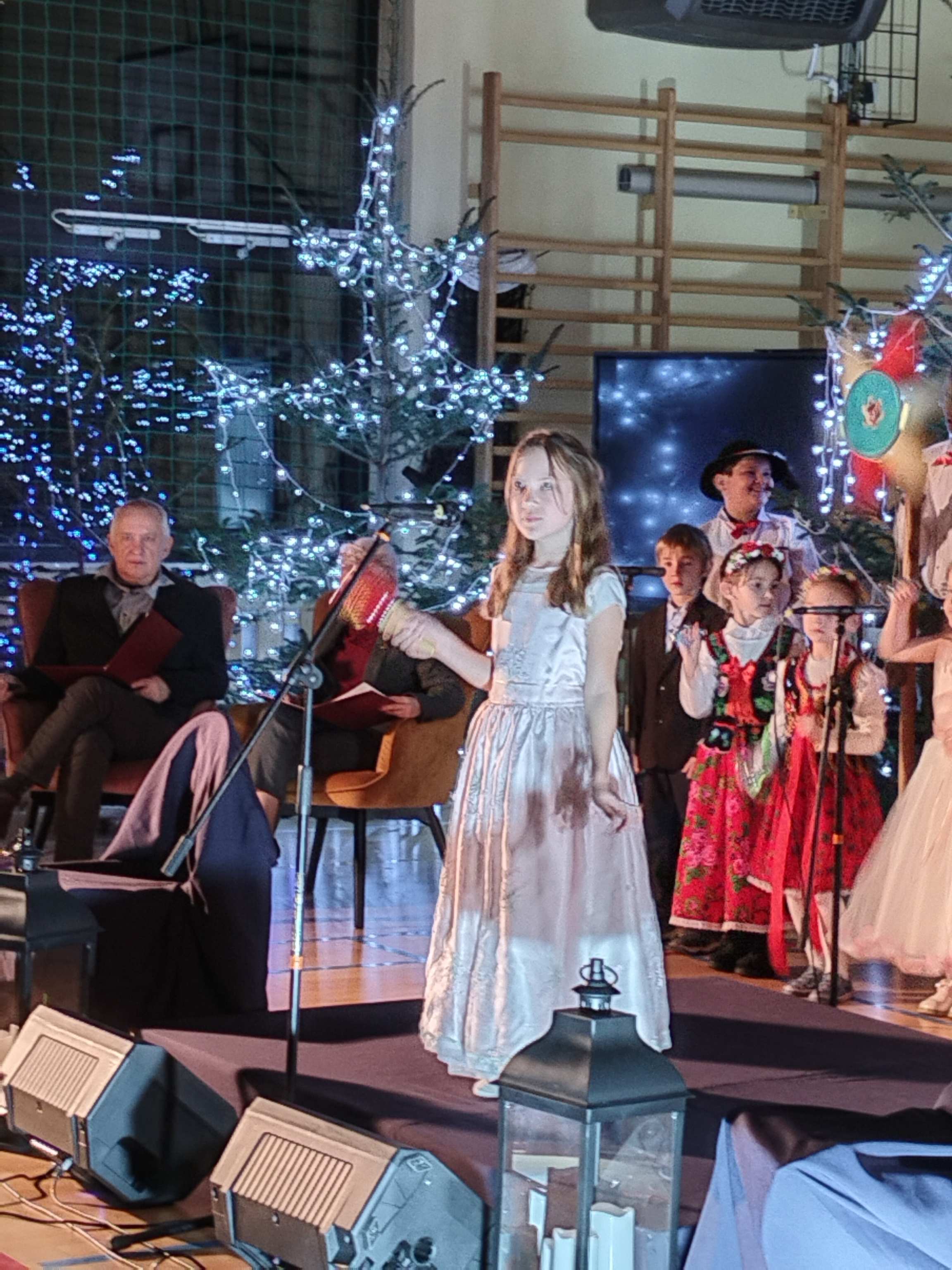 Dnia 20 grudnia 2024 roku w naszej szkole odbył się koncert kolęd, który z radością wypełnił atmosferę zbliżających się Świąt Bożego Narodzenia. Wydarzenie miało miejsce w sali gimnastycznej, która została pięknie udekorowana na tę okazję – w tle widniała szopka, a w powietrzu unosił się zapach świeżych świerkowych gałązek.