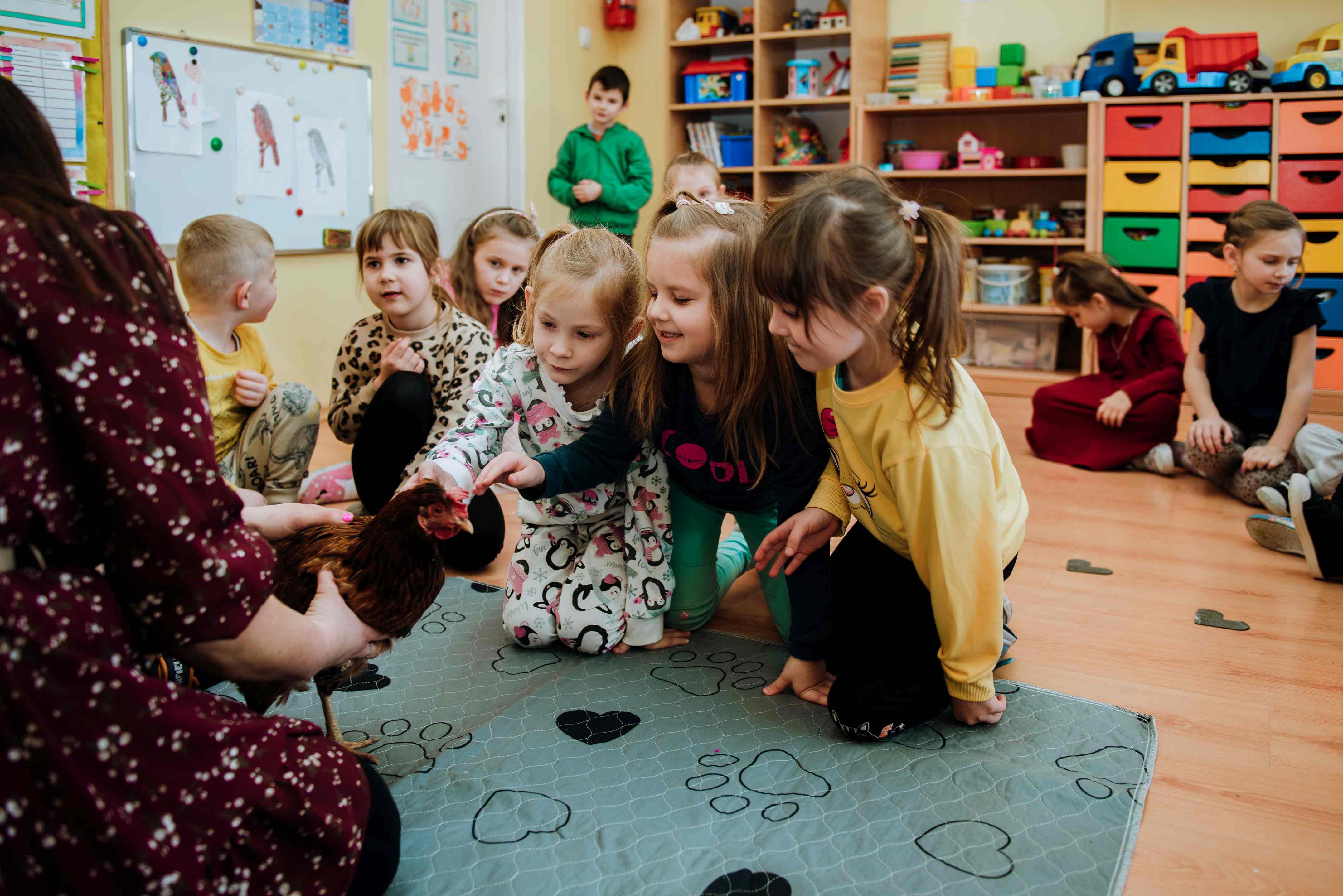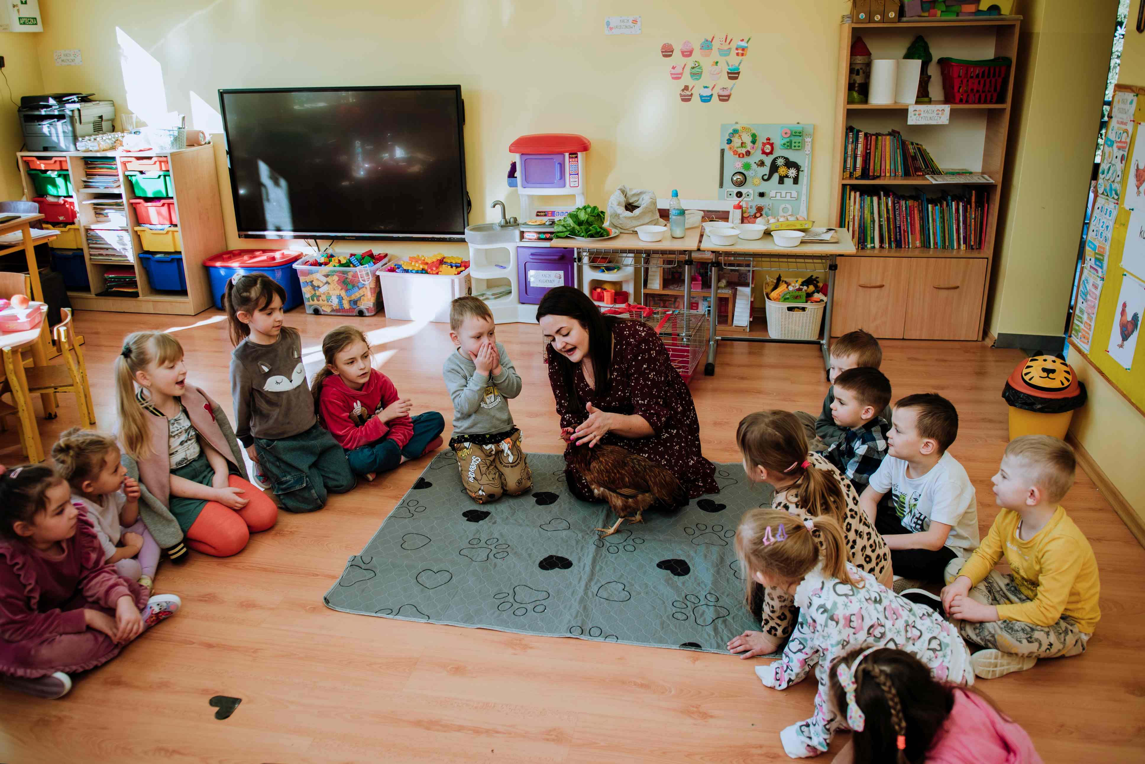 W drugiej części warsztatów przedszkolaki wyruszyły w podróż do świata zwierząt gospodarskich, których życie i zwyczaje przybliżyła im bohaterka zajęć – „Kurka Wędrowniczka”. Dzięki tej interaktywnej lekcji dzieci poznały sposób odżywiania zwierząt oraz ich codzienne życie na farmie. Zajęcia, nie tylko wzbogaciły wiedzę uczestników, ale także zapewniły im mnóstwo śmiechu i zabawy.
